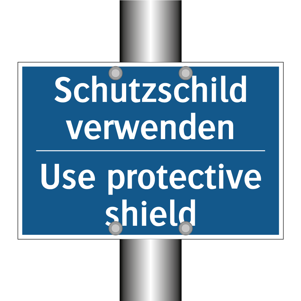 Zweisprachiges Verbotsschild mit deutschem Text Schutzschild verwenden und englischem Text Use protective shield
