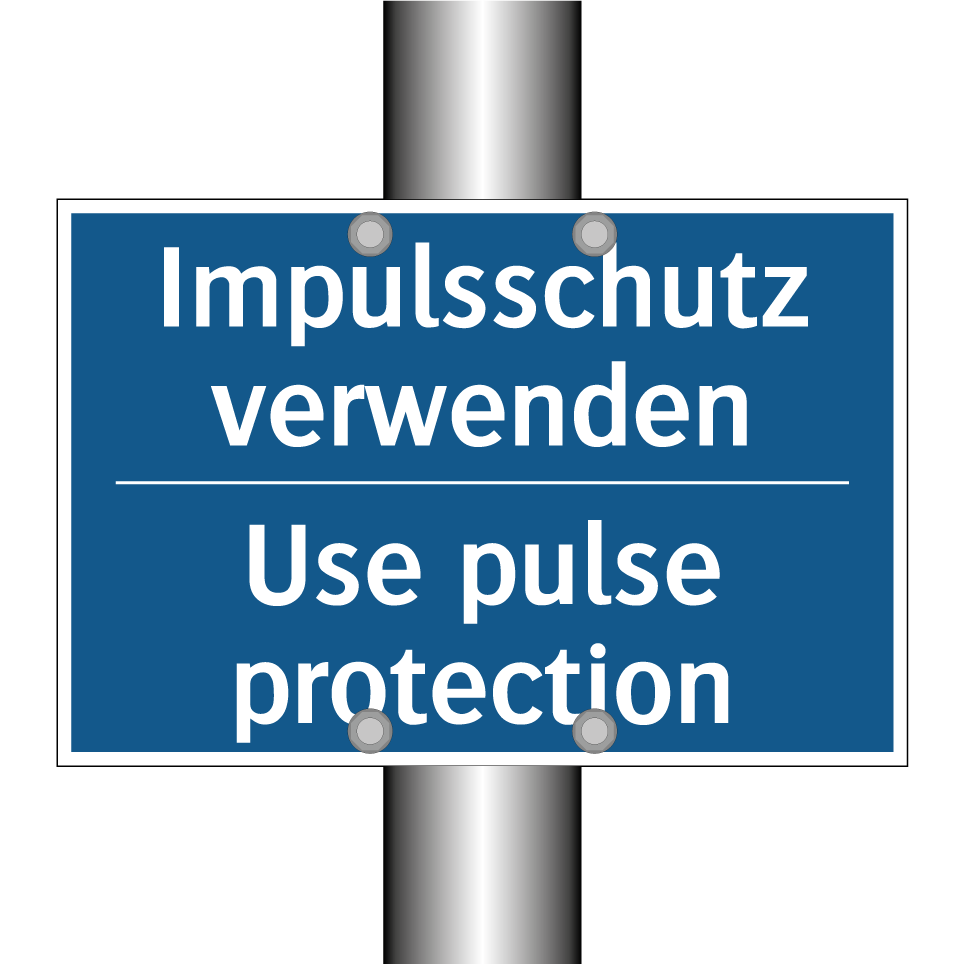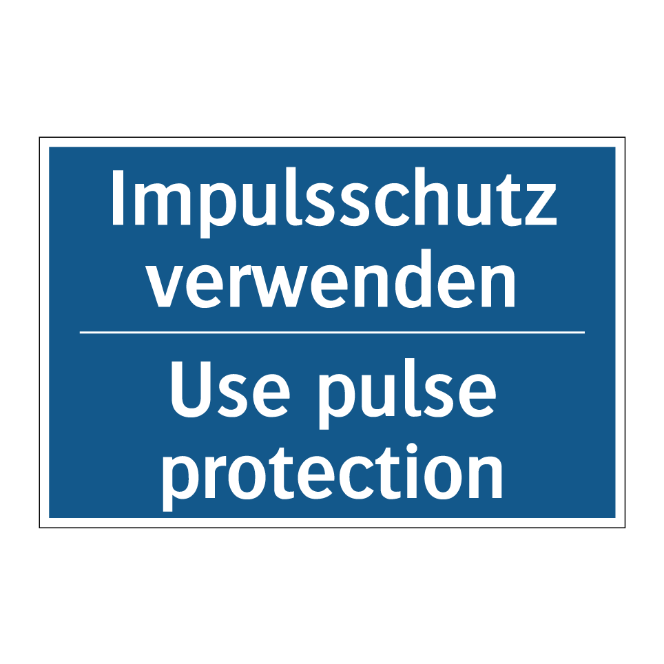 Zweisprachiges Verbotsschild mit deutschem Text Impulsschutz verwenden und englischem Text Use pulse protection