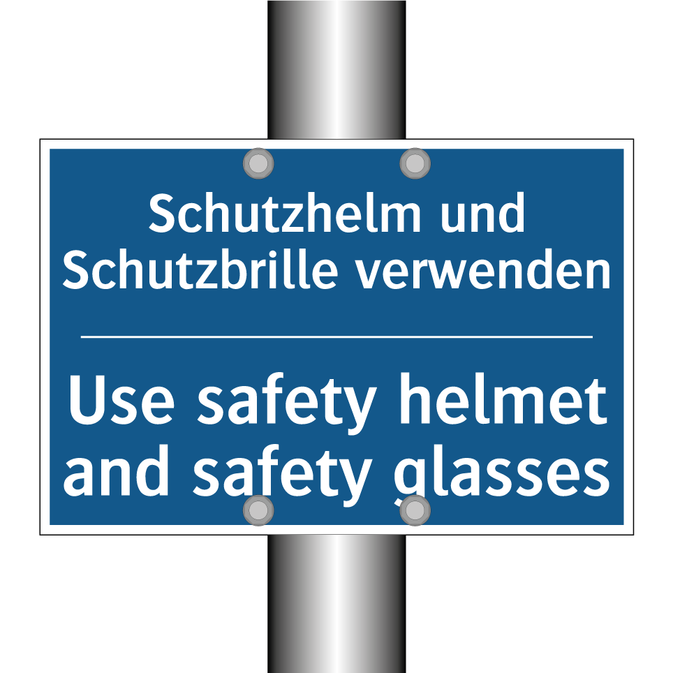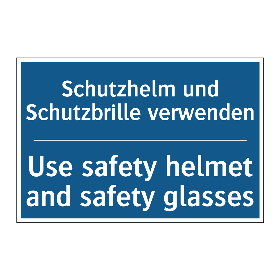 Zweisprachiges Verbotsschild mit deutschem Text Schutzhelm und Schutzbrille verwenden und englischem Text Use safety helmet and safety glasses