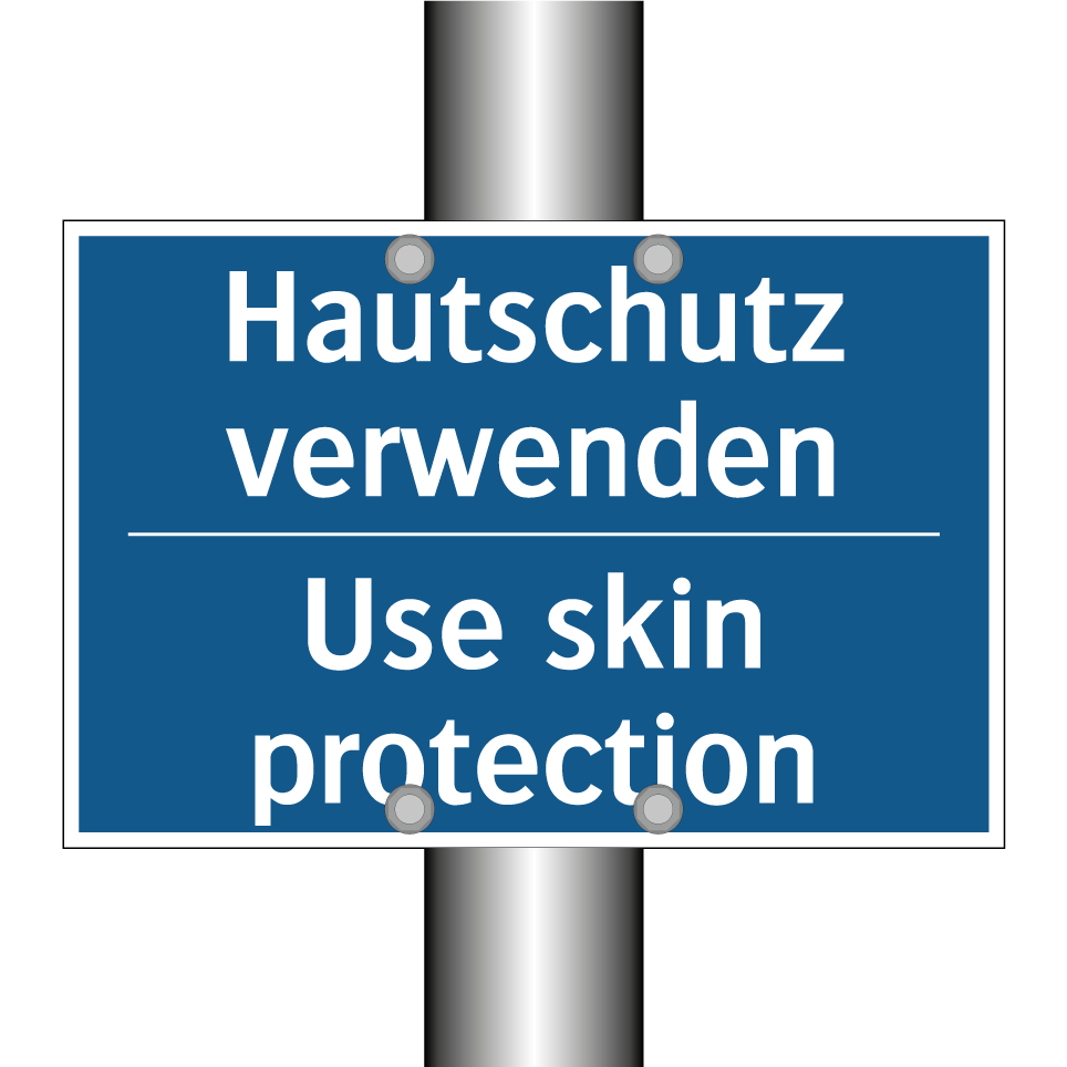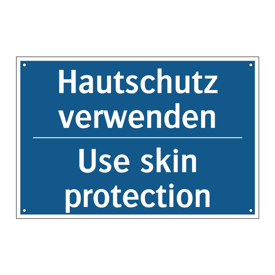 Zweisprachiges Verbotsschild mit deutschem Text Hautschutz verwenden und englischem Text Use skin protection