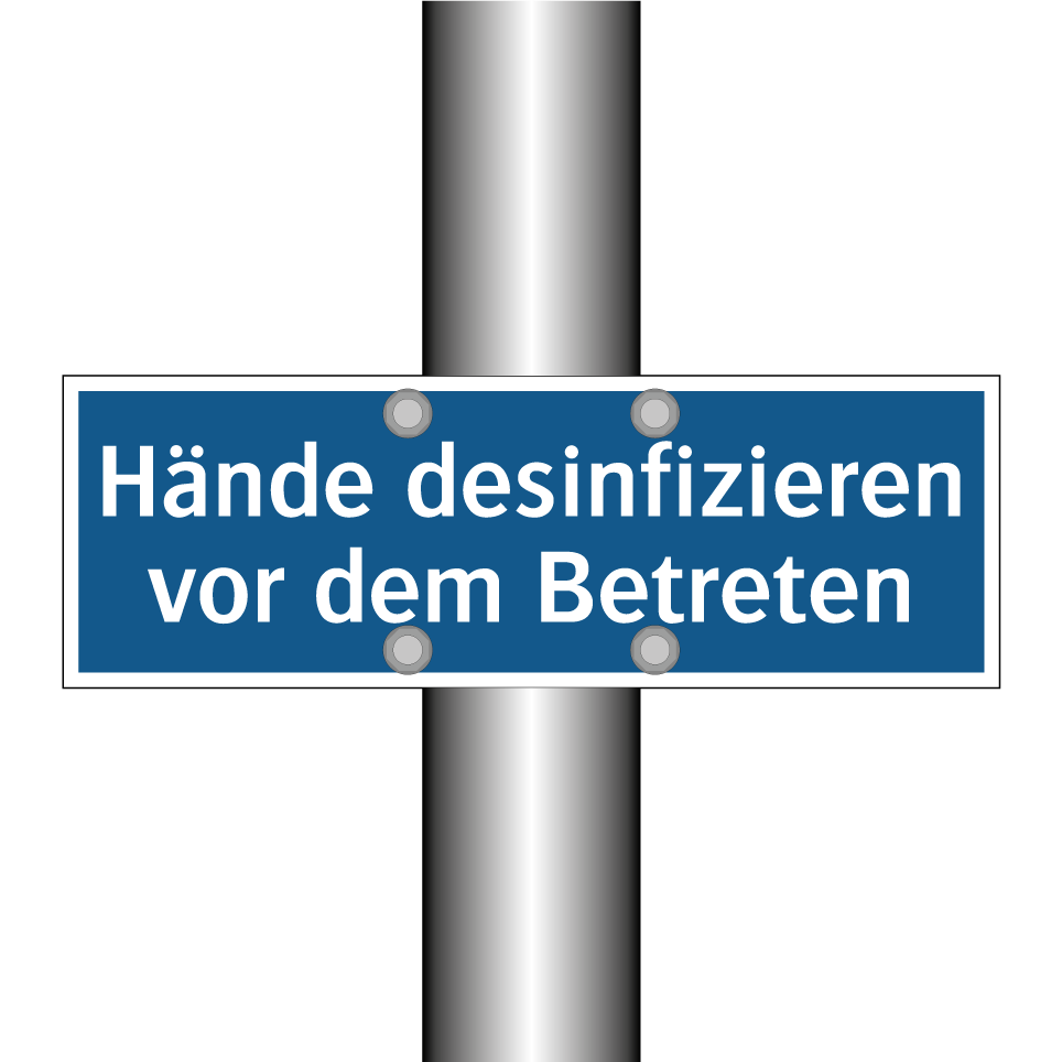 Gebotsschild mit dem Text Hände desinfizieren vor dem Betreten