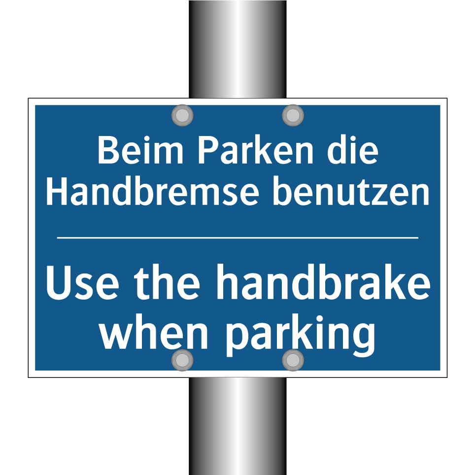 Zweisprachiges Verbotsschild mit deutschem Text Beim Parken die Handbremse benutzen und englischem Text Use the handbrake when parking