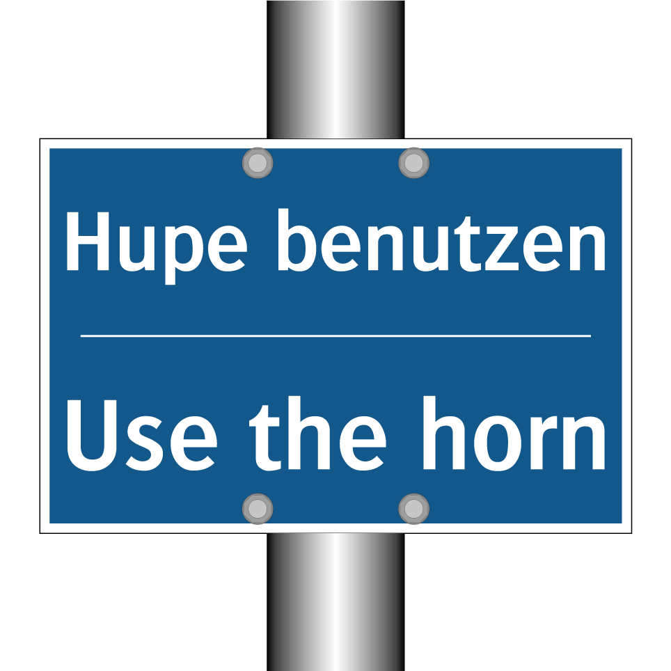 Zweisprachiges Verbotsschild mit deutschem Text Hupe benutzen und englischem Text Use the horn