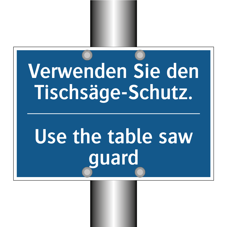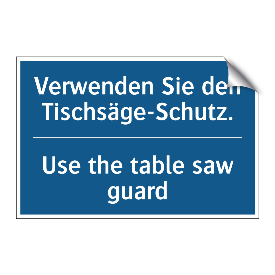 Zweisprachiges Verbotsschild mit deutschem Text Verwenden Sie den Tischsäge-Schutz. und englischem Text Use the table saw guard