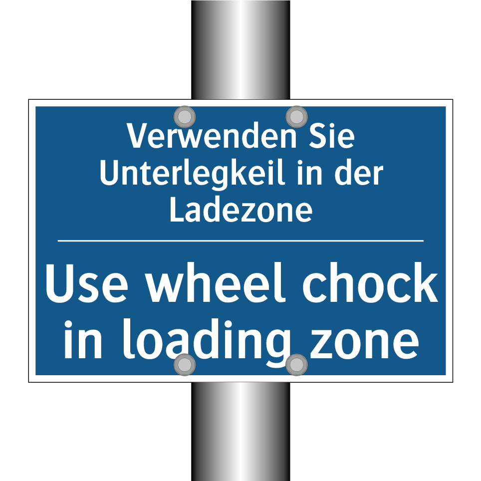 Zweisprachiges Verbotsschild mit deutschem Text Verwenden Sie Unterlegkeil in der Ladezone und englischem Text Use wheel chock in loading zone