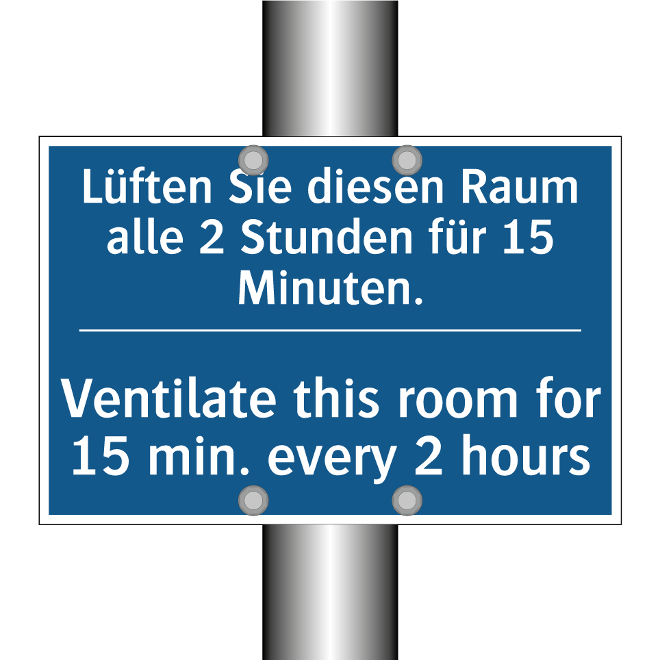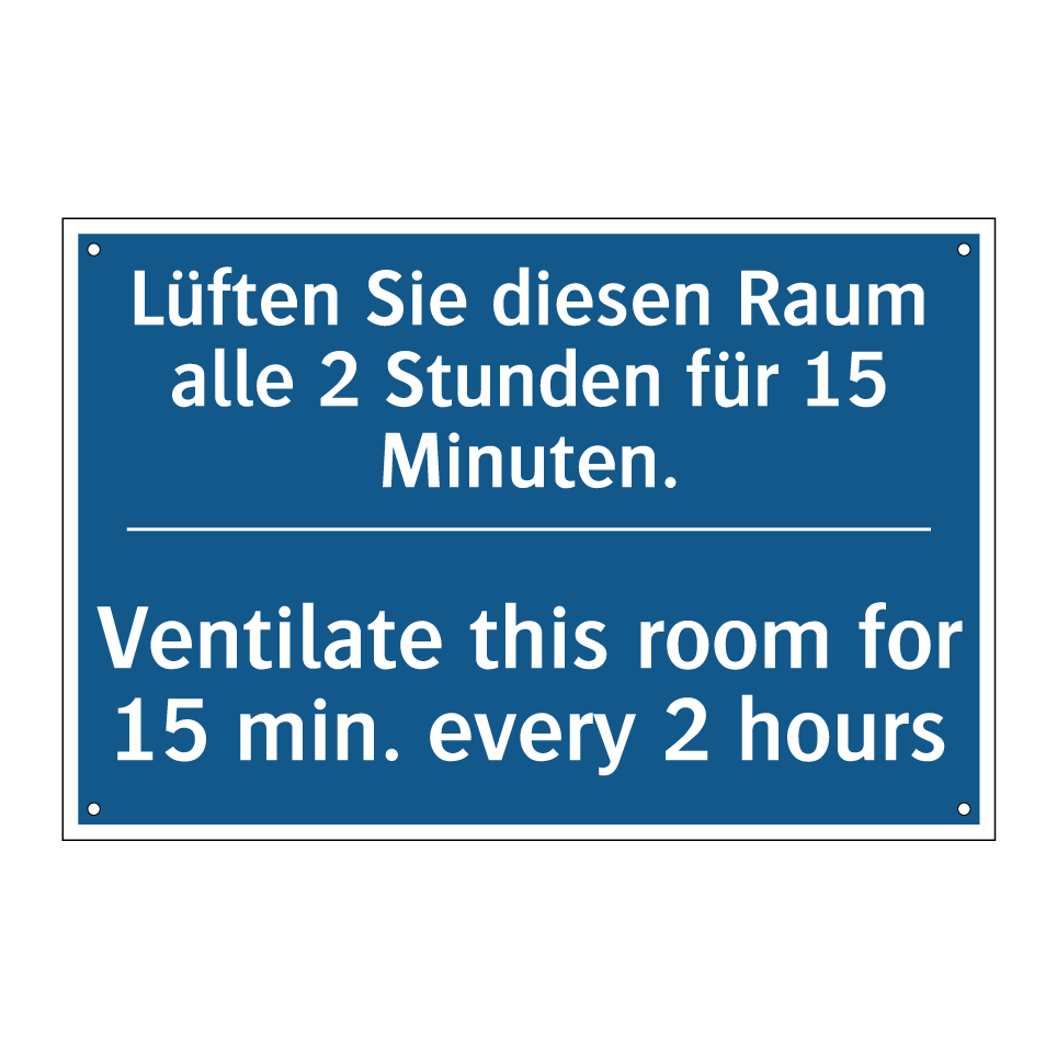 Zweisprachiges Verbotsschild mit deutschem Text Lüften Sie diesen Raum alle 2 Stunden für 15 Minuten. und englischem Text Ventilate this room for 15 min. every 2 hours