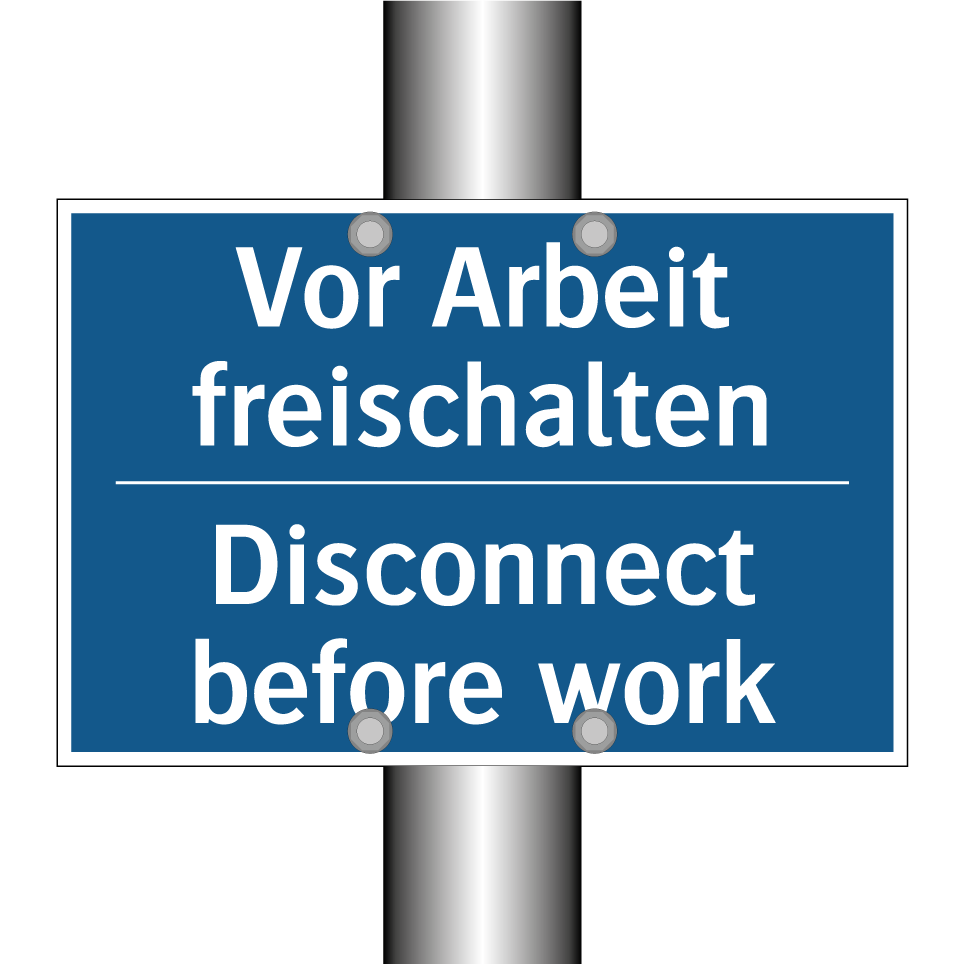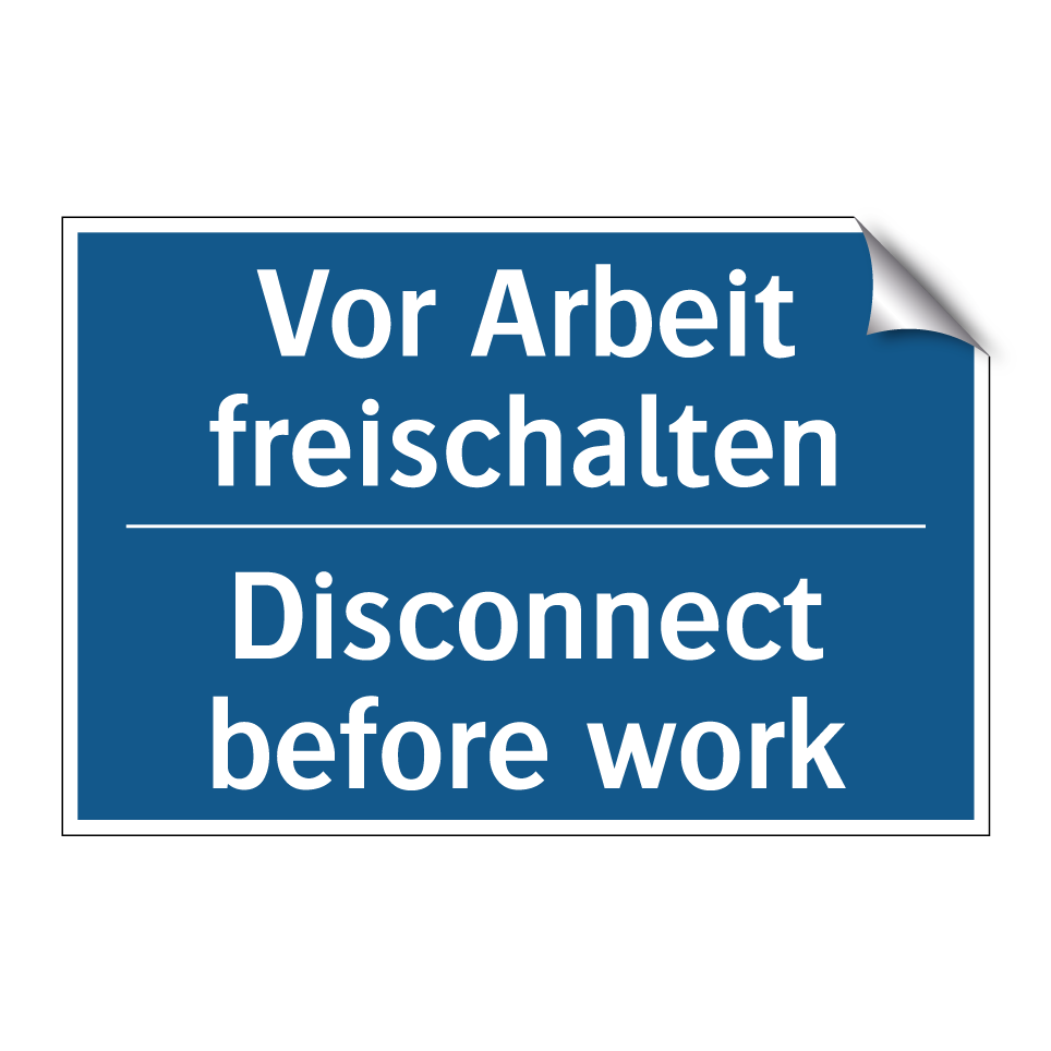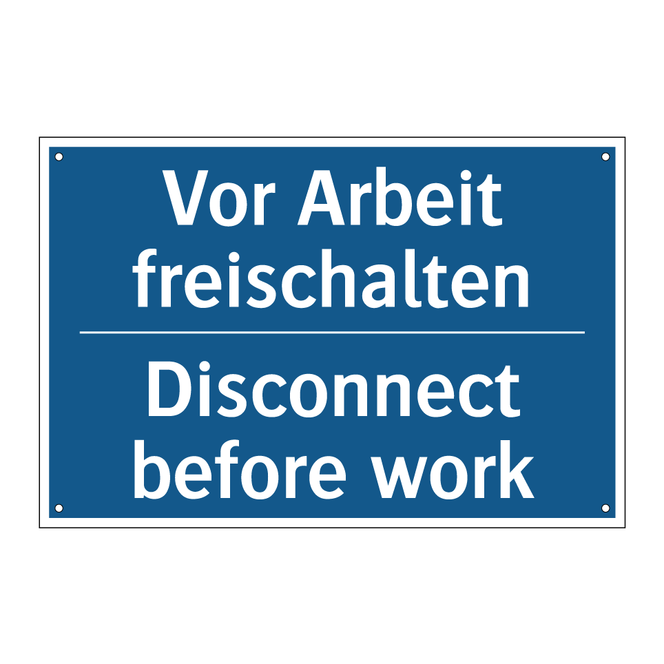 Zweisprachiges Verbotsschild mit deutschem Text Vor Arbeit freischalten und englischem Text Disconnect before work