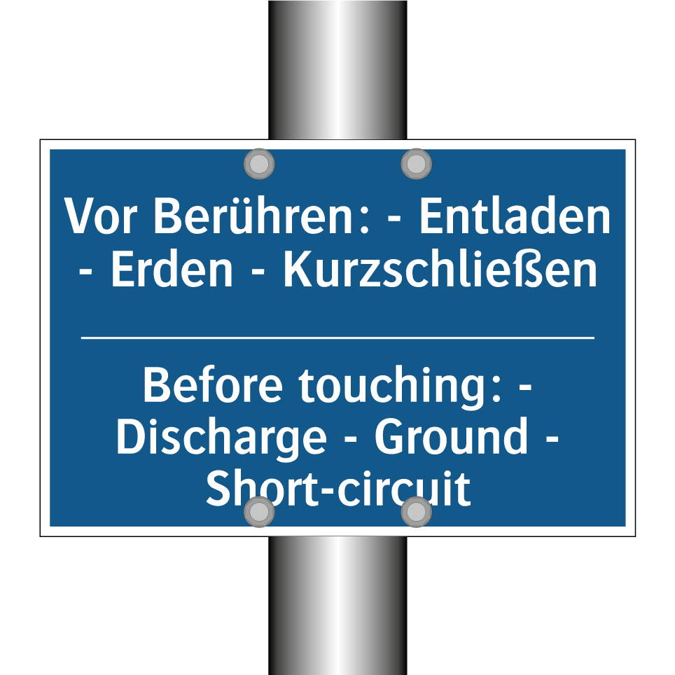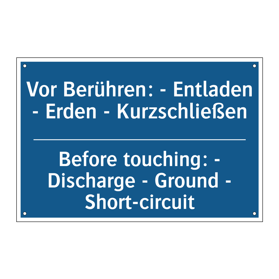 Zweisprachiges Verbotsschild mit deutschem Text Vor Berühren: - Entladen - Erden - Kurzschließen und englischem Text Before touching: - Discharge - Ground - Short-circuit