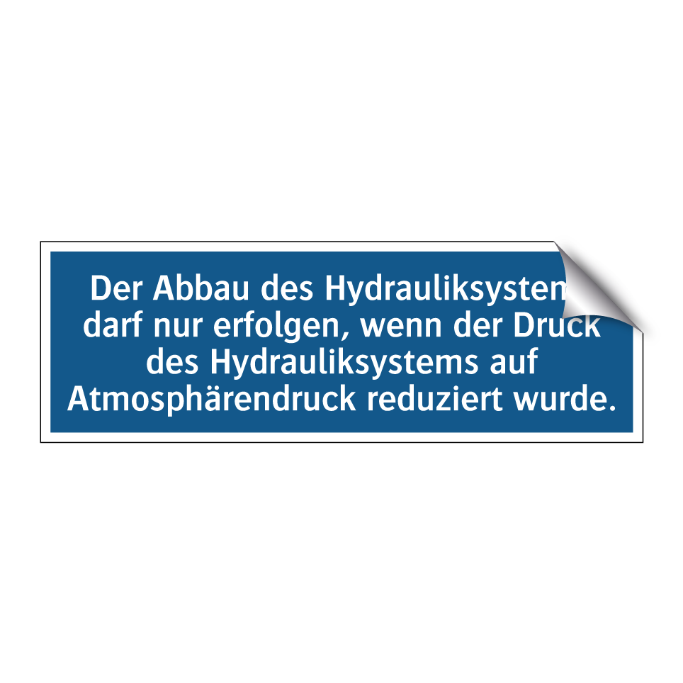 Gebotsschild mit dem Text Der Abbau des Hydrauliksystems darf nur erfolgen, wenn der Druck des Hydrauliksystems auf Atmosphärendruck reduziert wurde.