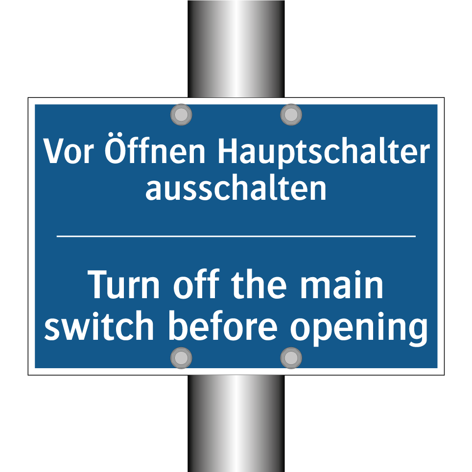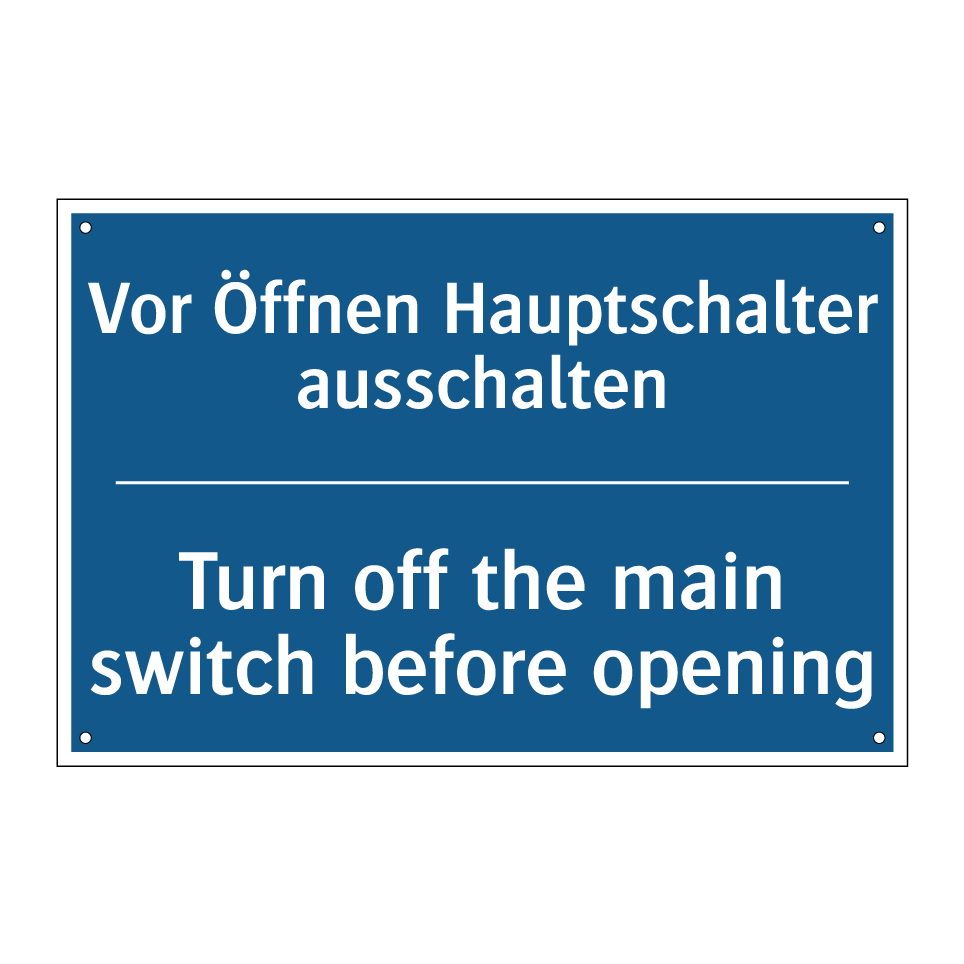 Zweisprachiges Verbotsschild mit deutschem Text Vor Öffnen Hauptschalter ausschalten und englischem Text Turn off the main switch before opening