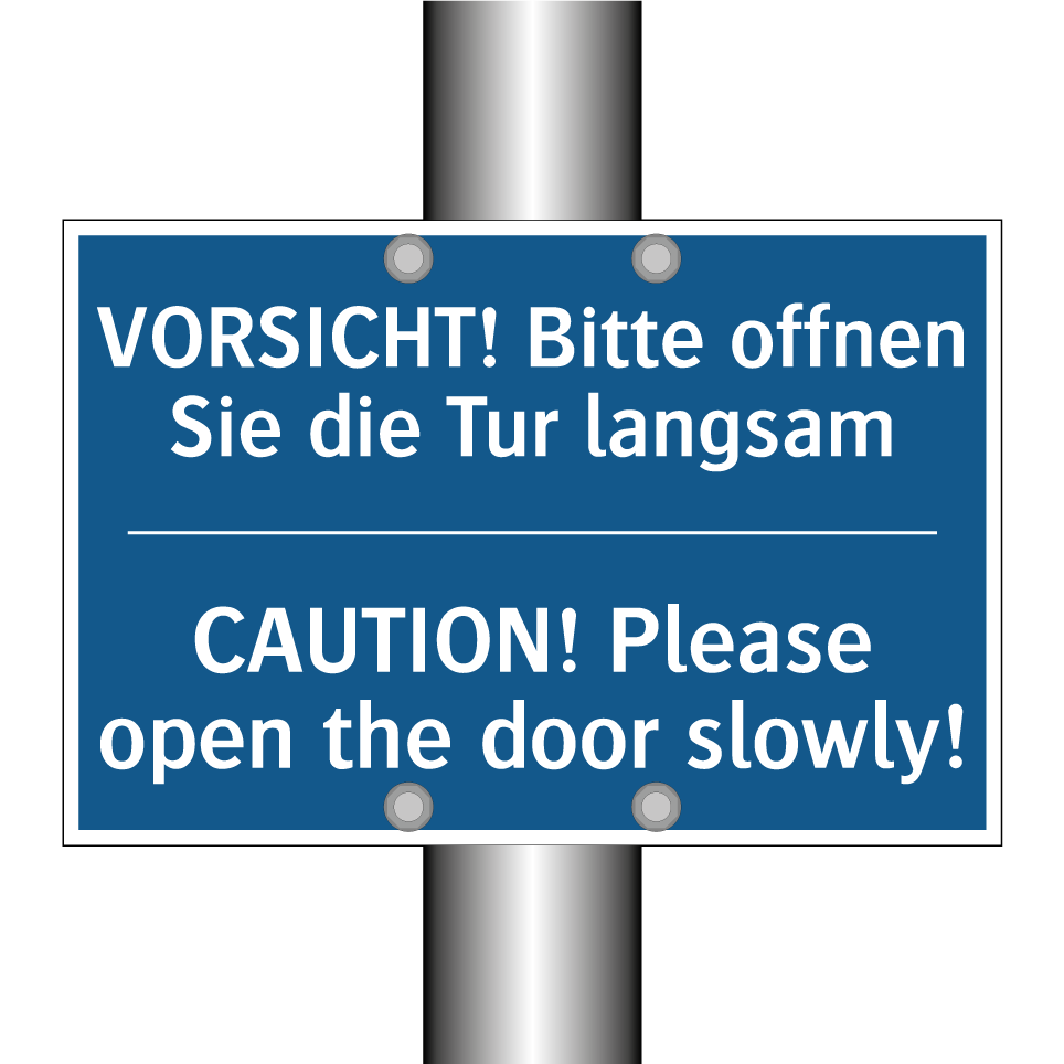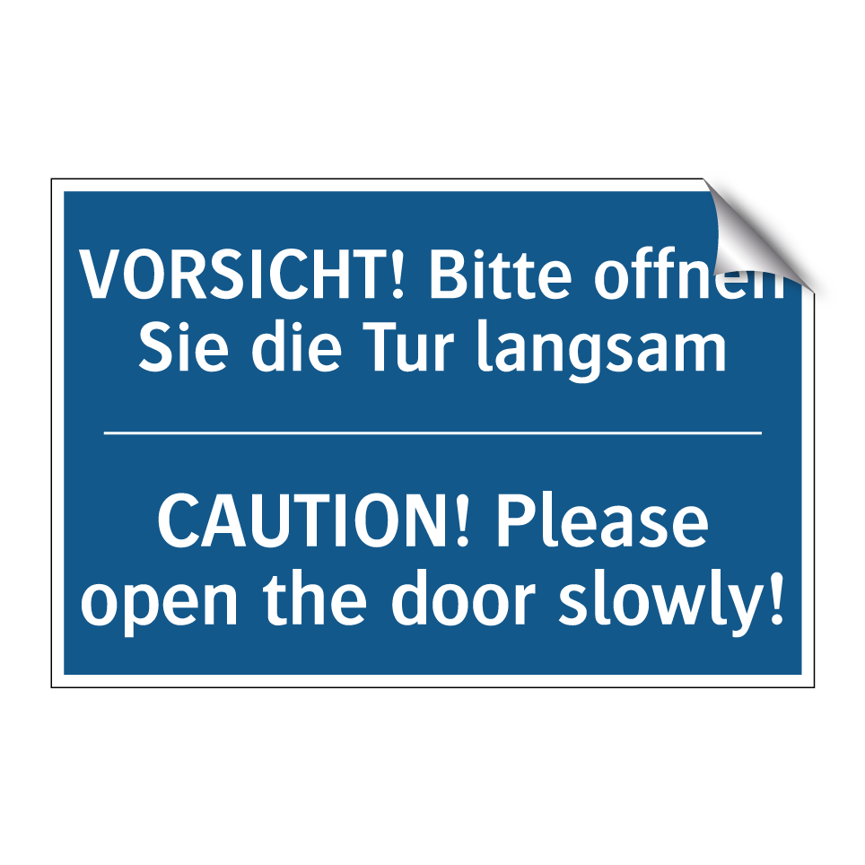 Zweisprachiges Verbotsschild mit deutschem Text VORSICHT! Bitte offnen Sie die Tur langsam und englischem Text CAUTION! Please open the door slowly!