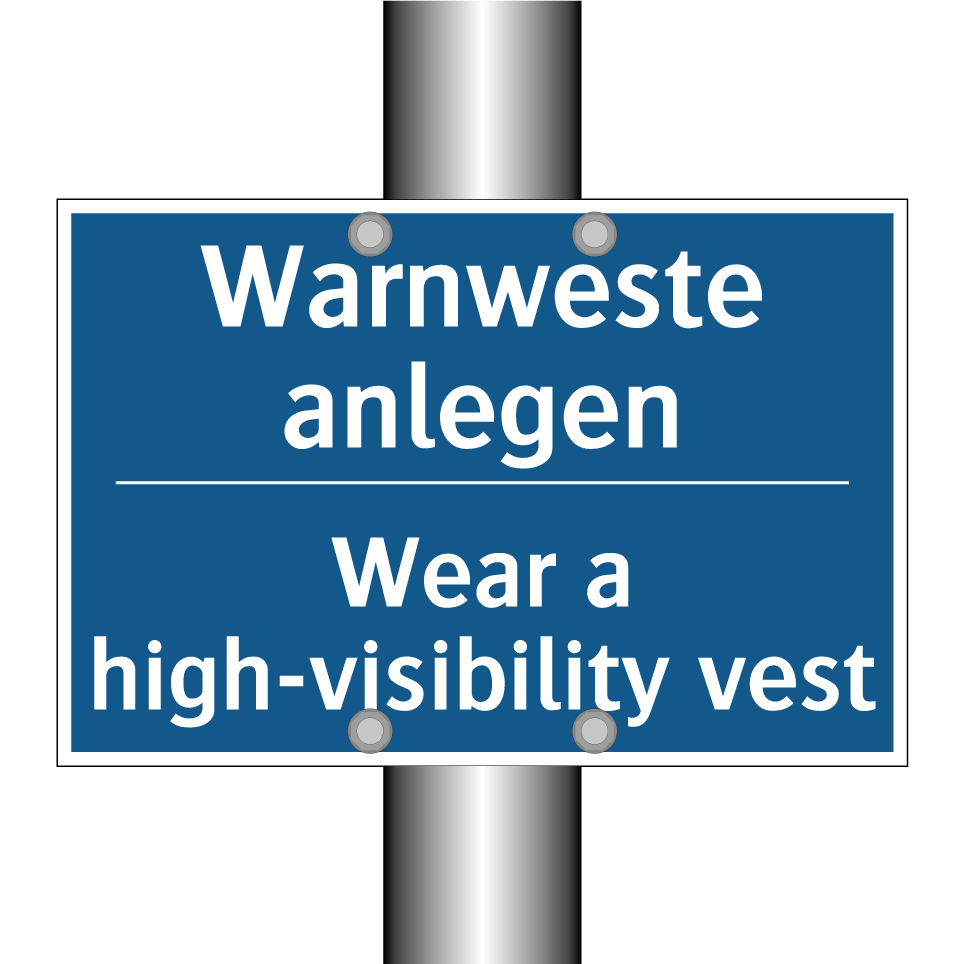 Zweisprachiges Verbotsschild mit deutschem Text Warnweste anlegen und englischem Text Wear a high-visibility vest