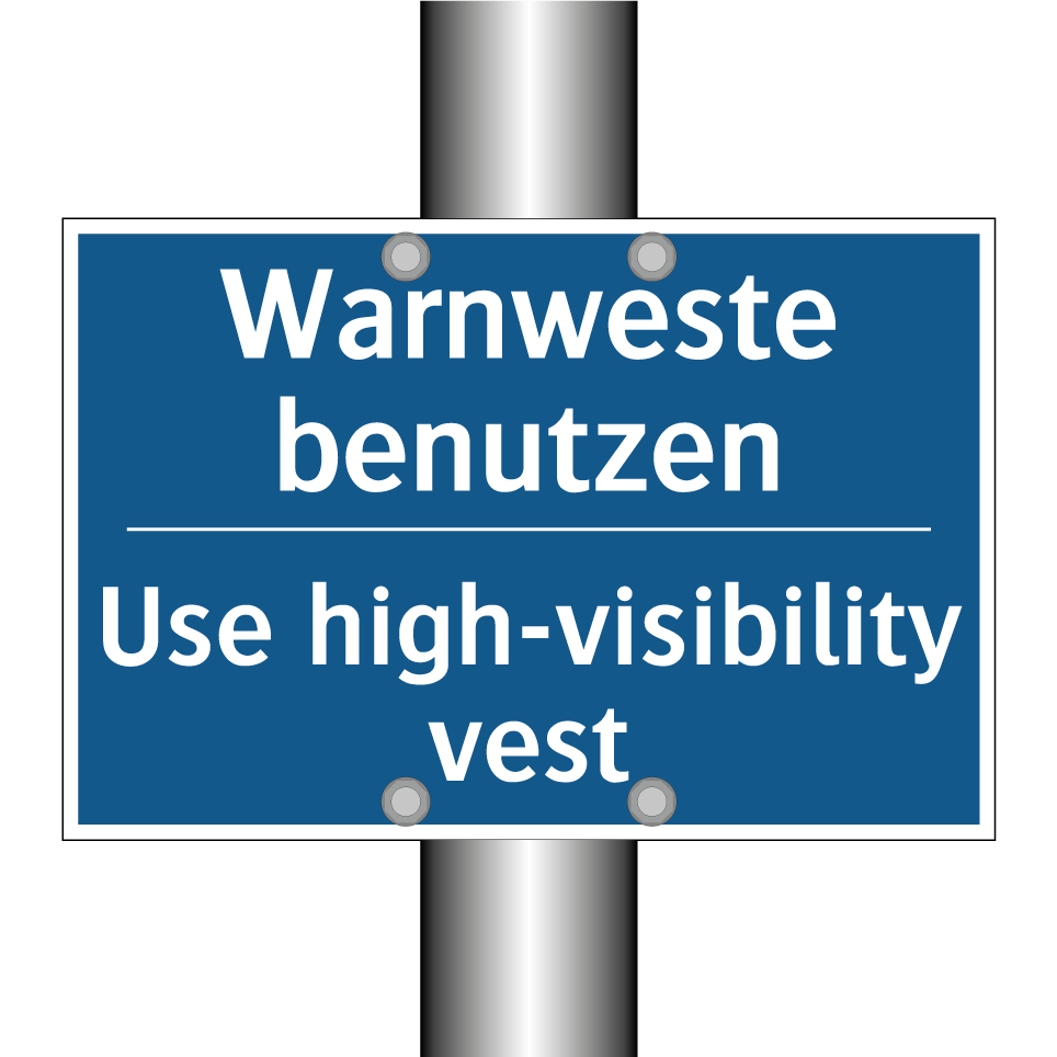 Zweisprachiges Verbotsschild mit deutschem Text Warnweste benutzen und englischem Text Use high-visibility vest