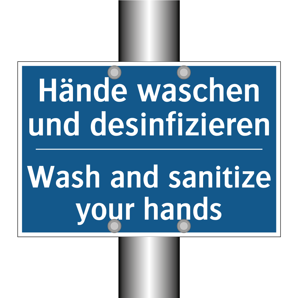 Zweisprachiges Verbotsschild mit deutschem Text Hände waschen und desinfizieren und englischem Text Wash and sanitize your hands