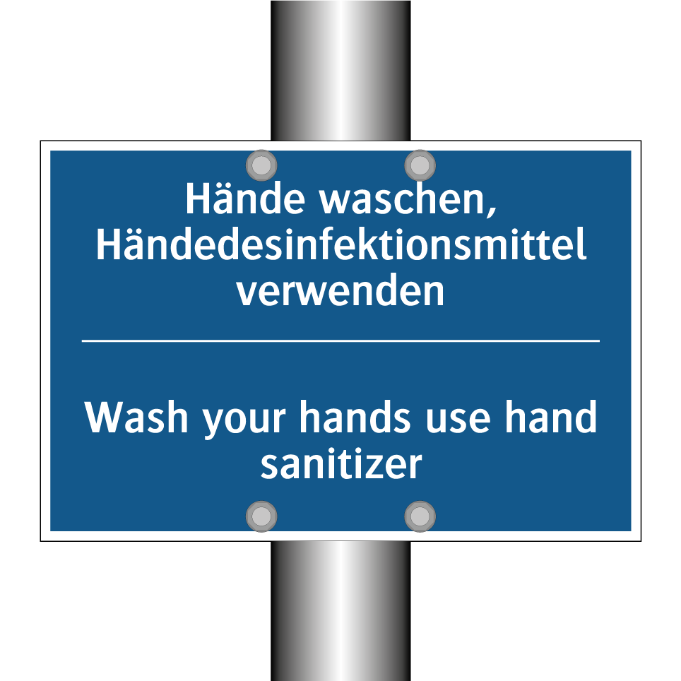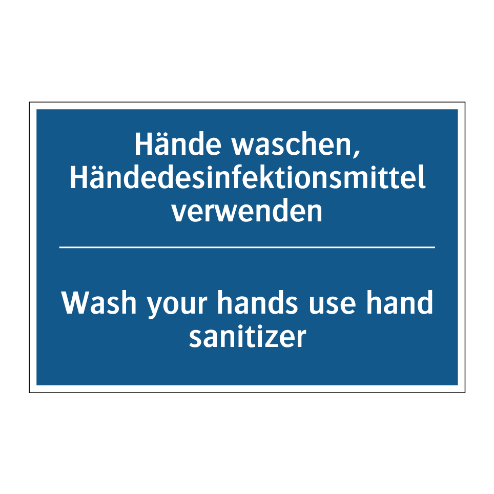 Diese Gebotsschild mit blauer Hintergrundfarbe und weißer Schrift ist ideal für den Einsatz in Bereichen, in denen Hygiene oberste Priorität hat. Die zweisprachige Beschriftung auf Deutsch und Englisch macht sie besonders nützlich in internationalen Umgebungen wie Flughäfen, Bahnhöfen oder großen Bürogebäuden. Sie erinnert Mitarbeiter und Besucher daran, ihre Hände zu waschen und Desinfektionsmittel zu verwenden, um die Verbreitung von Keimen zu minimieren. Diese klare und prägnante Botschaft fördert ein sicheres und gesundes Umfeld. Platzieren Sie die Gebotsschild in Waschräumen, Eingangsbereichen oder an stark frequentierten Orten, um die Einhaltung von Hygienestandards zu gewährleisten.