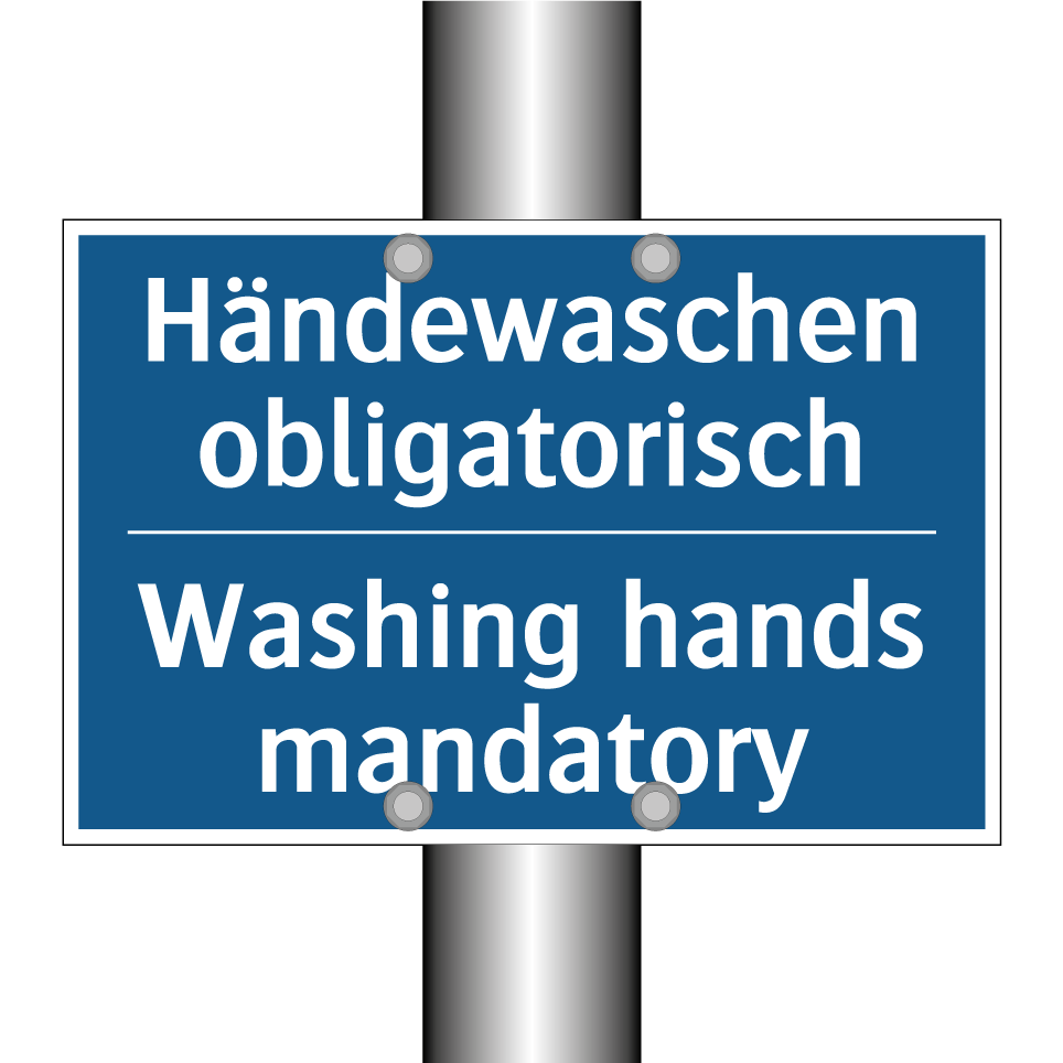 Zweisprachiges Verbotsschild mit deutschem Text Händewaschen obligatorisch und englischem Text Washing hands mandatory