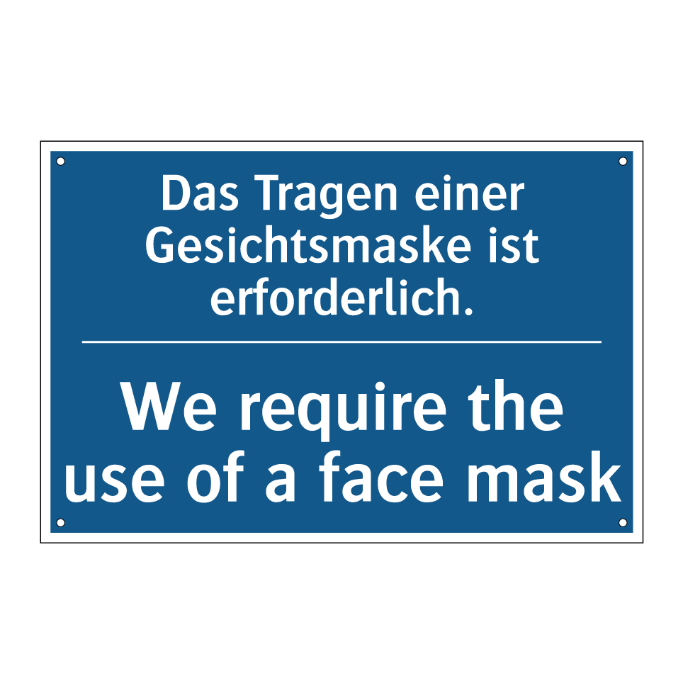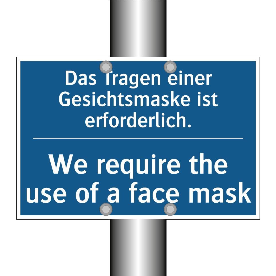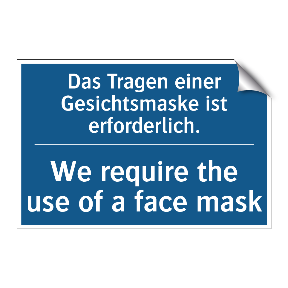 Zweisprachiges Verbotsschild mit deutschem Text Das Tragen einer Gesichtsmaske ist erforderlich. und englischem Text We require the use of a face mask