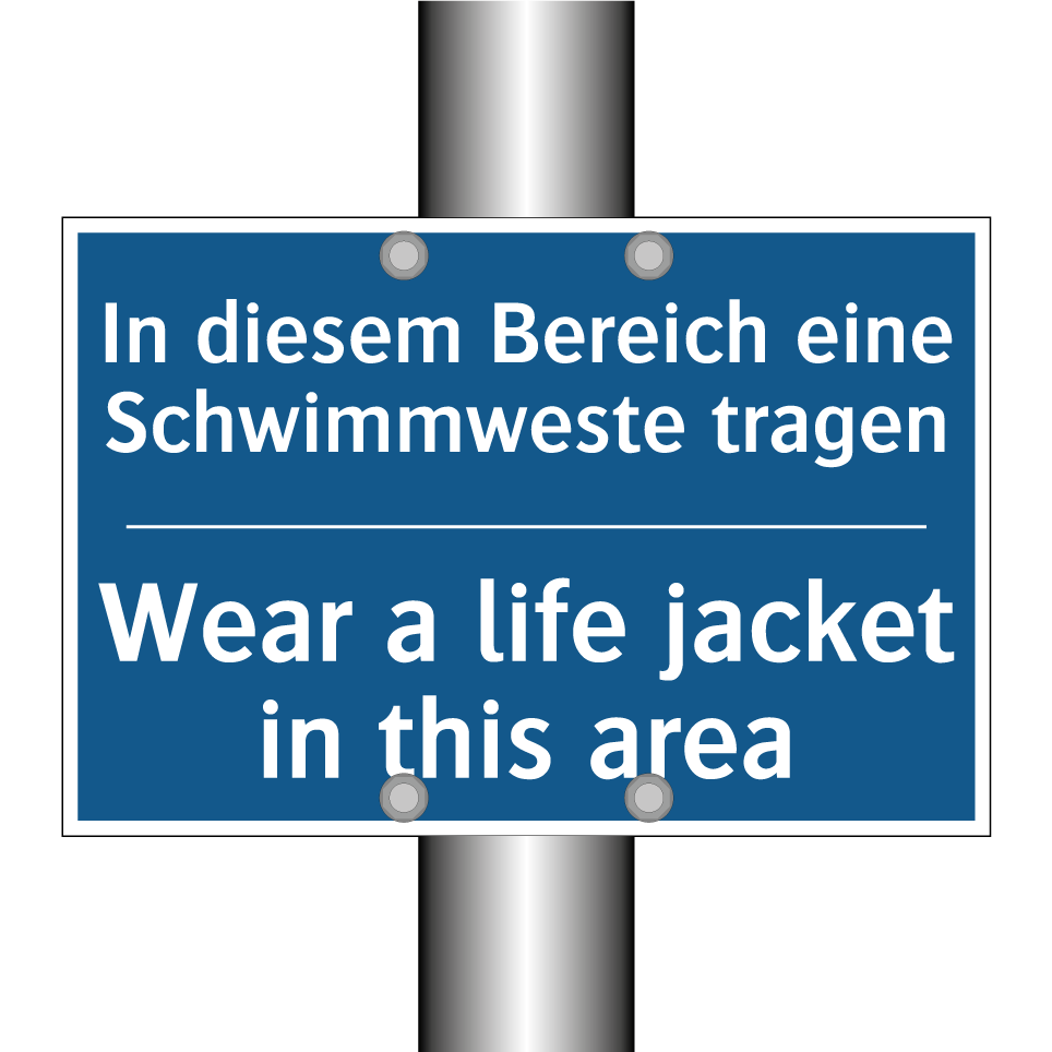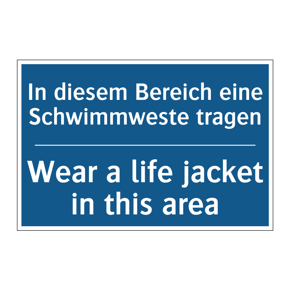 Zweisprachiges Verbotsschild mit deutschem Text In diesem Bereich eine Schwimmweste tragen und englischem Text Wear a life jacket in this area