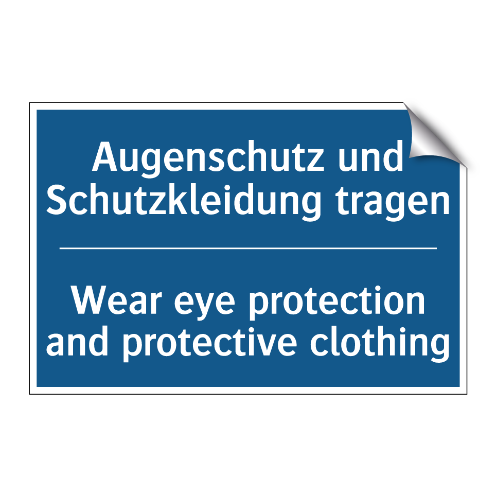 Zweisprachiges Verbotsschild mit deutschem Text Augenschutz und Schutzkleidung tragen und englischem Text Wear eye protection and protective clothing