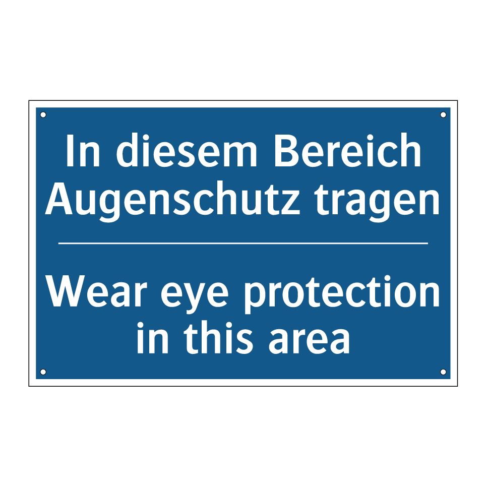 Zweisprachiges Verbotsschild mit deutschem Text In diesem Bereich Augenschutz tragen und englischem Text Wear eye protection in this area