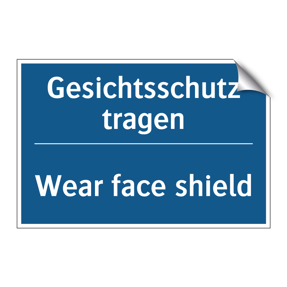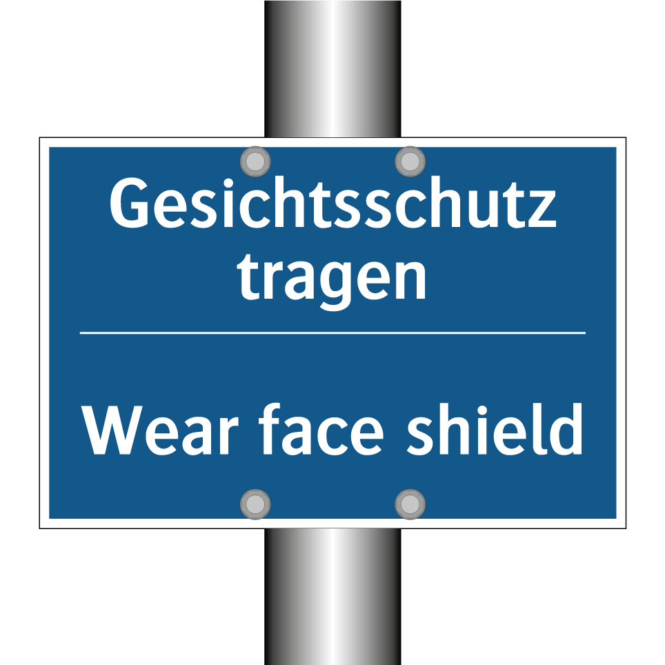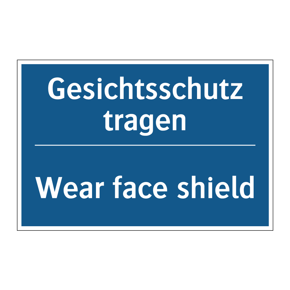 Zweisprachiges Verbotsschild mit deutschem Text Gesichtsschutz tragen und englischem Text Wear face shield