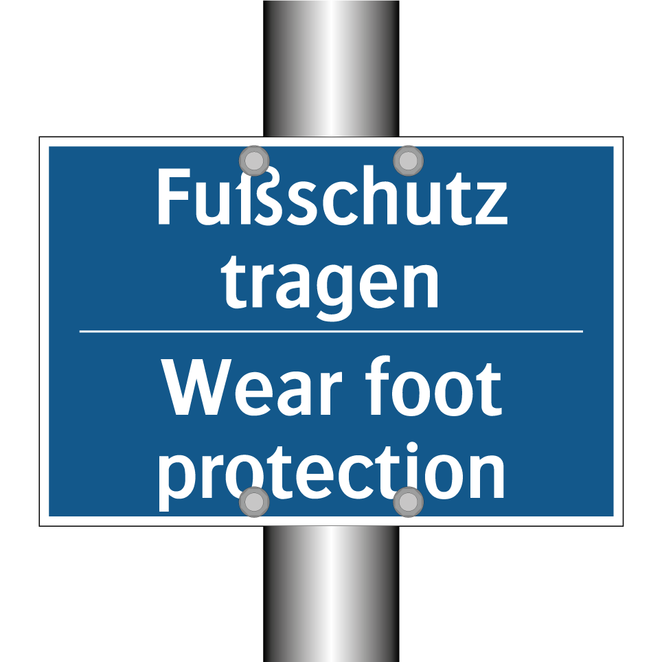 Zweisprachiges Verbotsschild mit deutschem Text Fußschutz tragen und englischem Text Wear foot protection