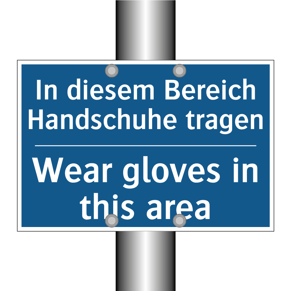 Zweisprachiges Verbotsschild mit deutschem Text In diesem Bereich Handschuhe tragen und englischem Text Wear gloves in this area