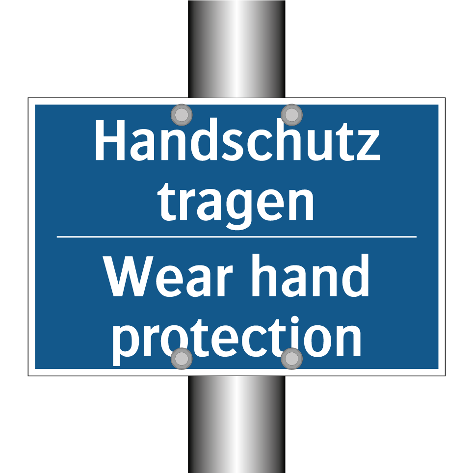Zweisprachiges Verbotsschild mit deutschem Text Handschutz tragen und englischem Text Wear hand protection