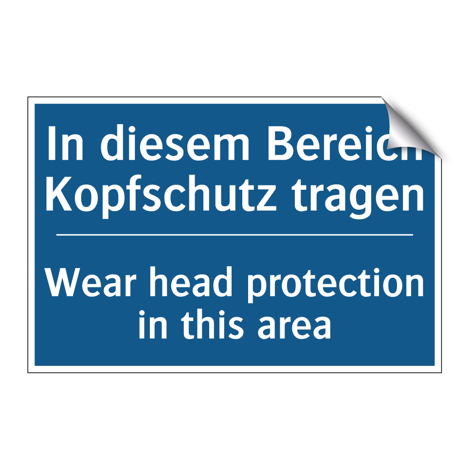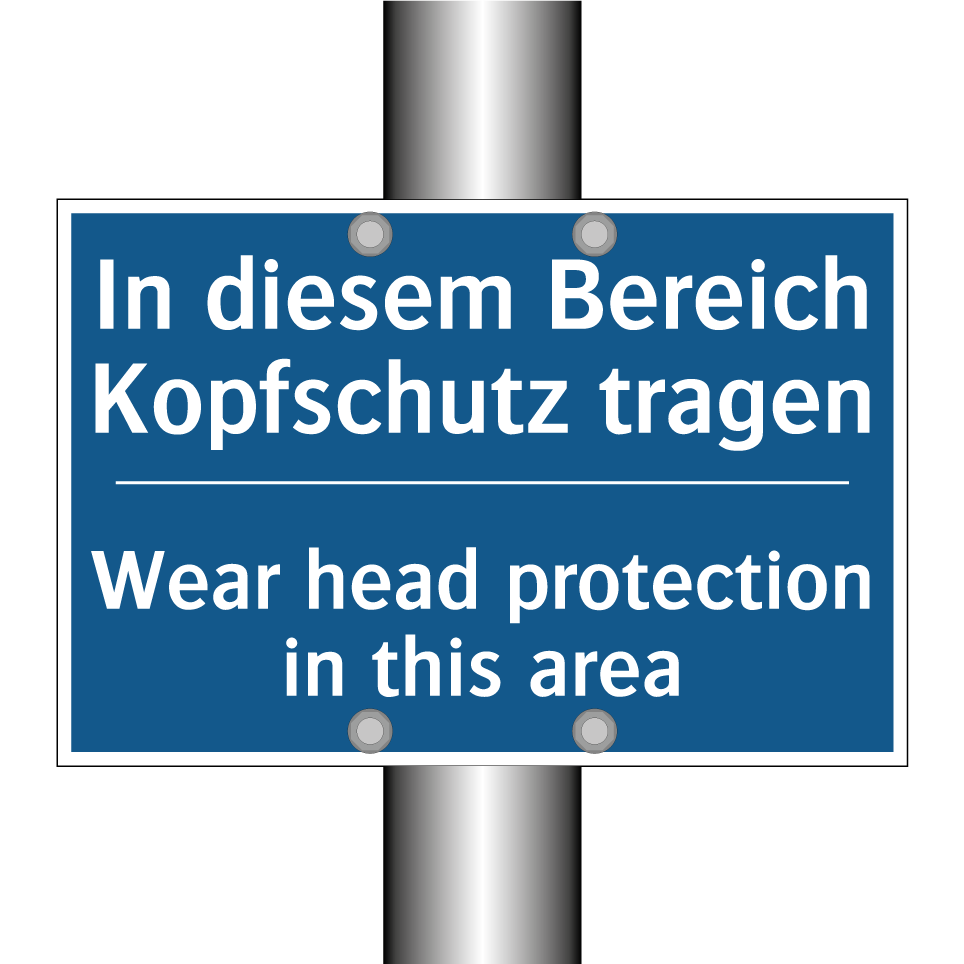 Zweisprachiges Verbotsschild mit deutschem Text In diesem Bereich Kopfschutz tragen und englischem Text Wear head protection in this area
