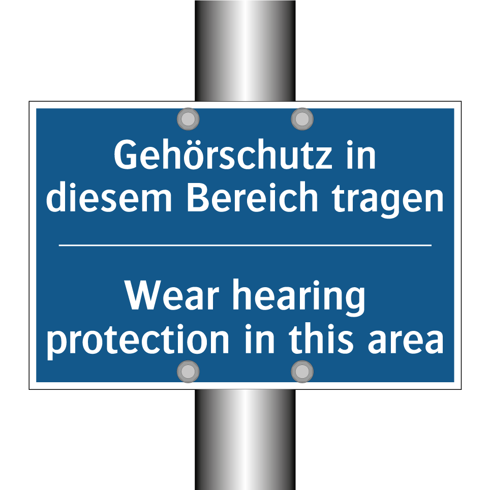 Zweisprachiges Verbotsschild mit deutschem Text Gehörschutz in diesem Bereich tragen und englischem Text Wear hearing protection in this area