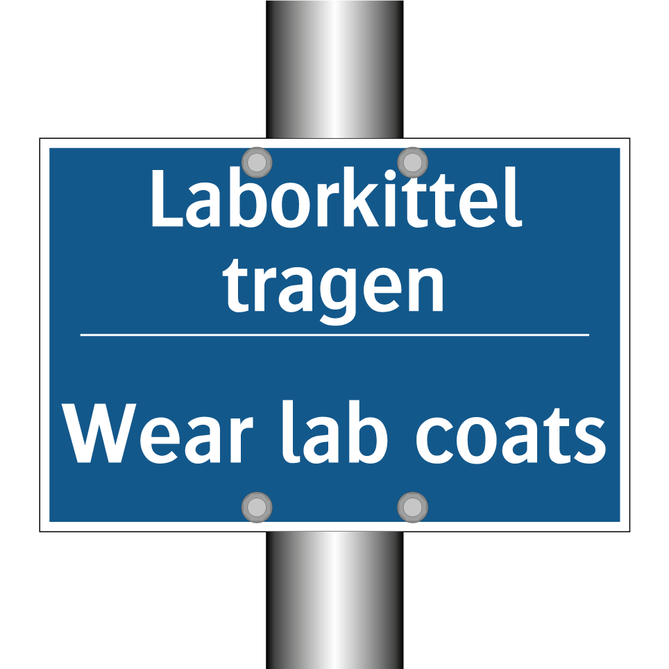 Zweisprachiges Verbotsschild mit deutschem Text Laborkittel tragen und englischem Text Wear lab coats
