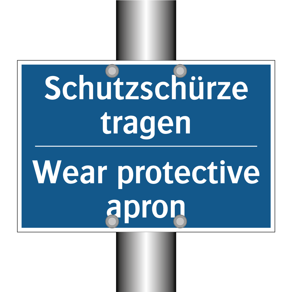 Zweisprachiges Verbotsschild mit deutschem Text Schutzschürze tragen und englischem Text Wear protective apron