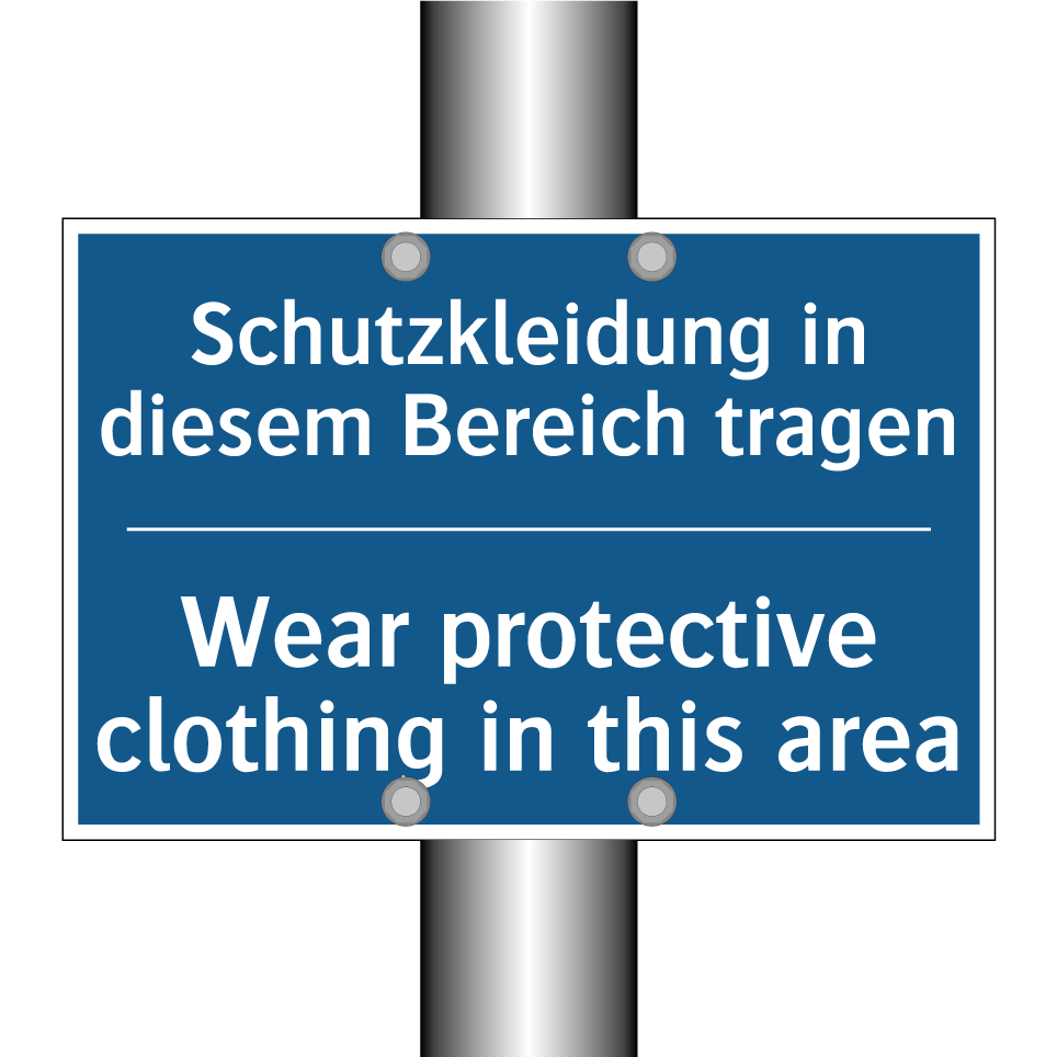 Zweisprachiges Verbotsschild mit deutschem Text Schutzkleidung in diesem Bereich tragen und englischem Text Wear protective clothing in this area