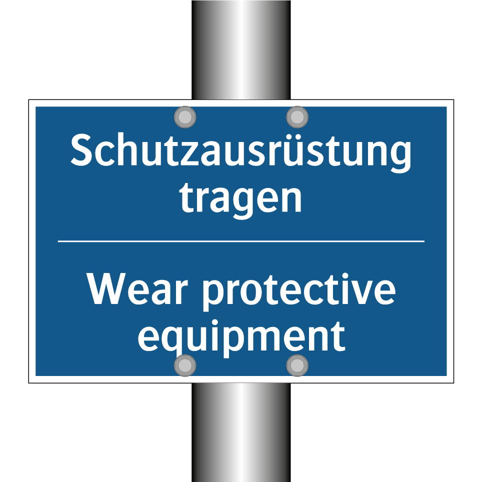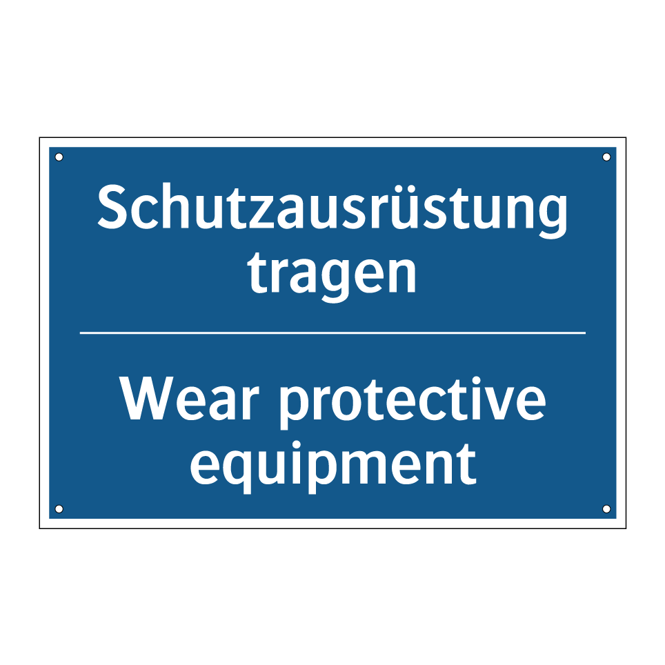 Zweisprachiges Verbotsschild mit deutschem Text Schutzausrüstung tragen und englischem Text Wear protective equipment