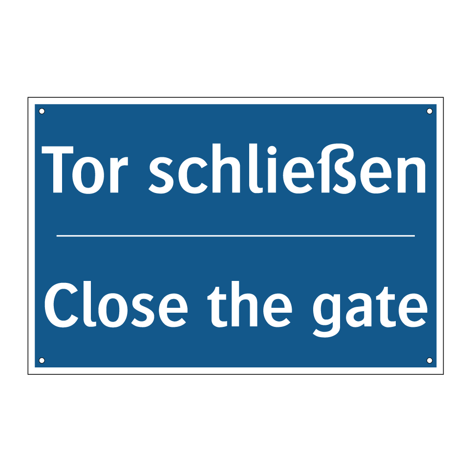 Zweisprachiges Verbotsschild mit deutschem Text Tor schließen und englischem Text Close the gate