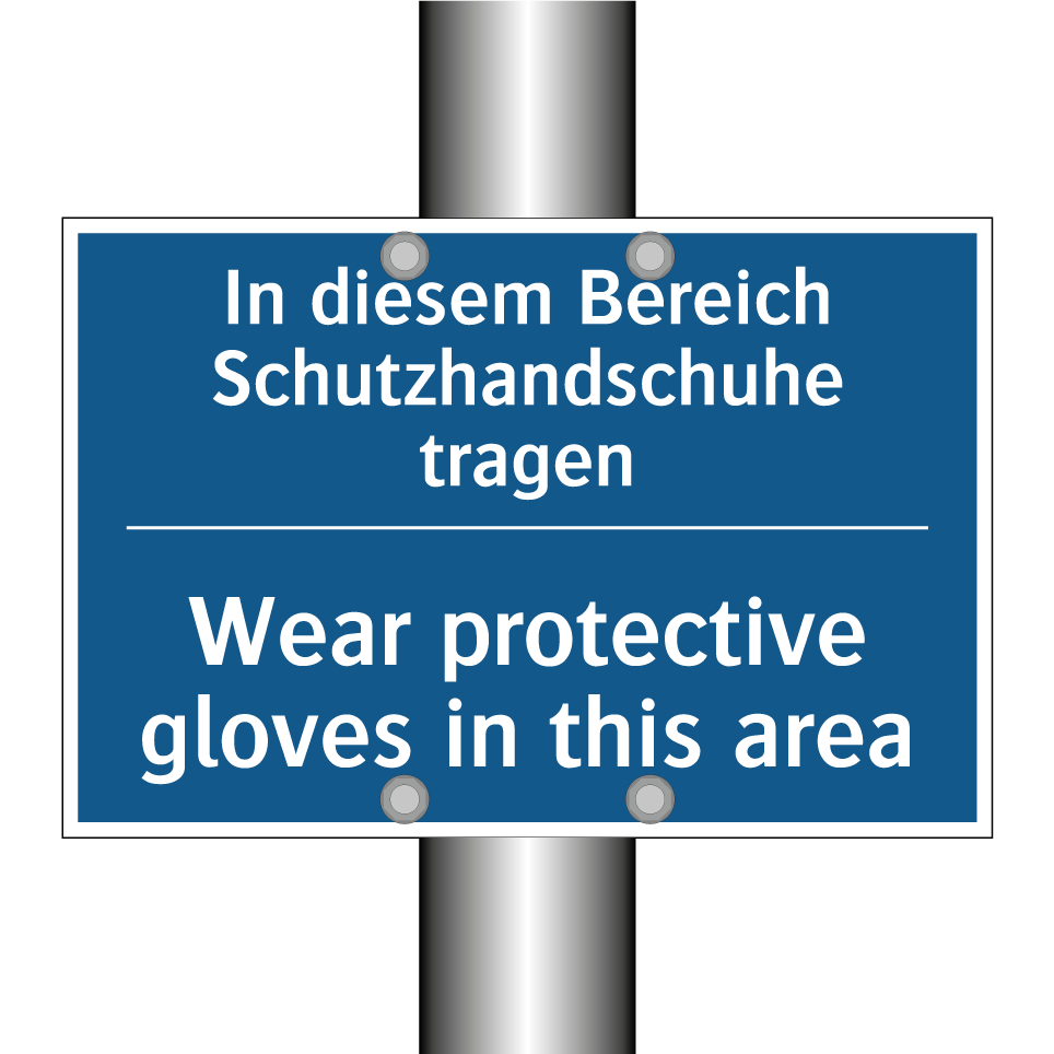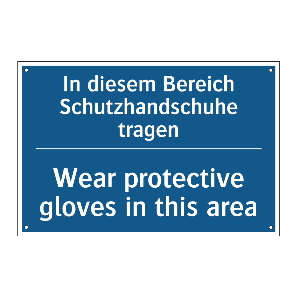Zweisprachiges Verbotsschild mit deutschem Text In diesem Bereich Schutzhandschuhe tragen und englischem Text Wear protective gloves in this area