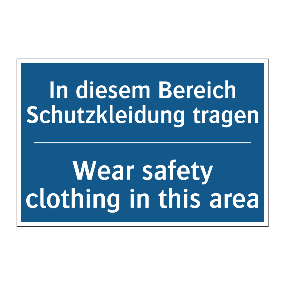 Zweisprachiges Verbotsschild mit deutschem Text In diesem Bereich Schutzkleidung tragen und englischem Text Wear safety clothing in this area