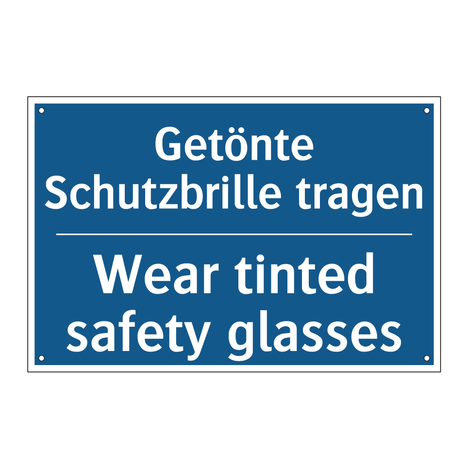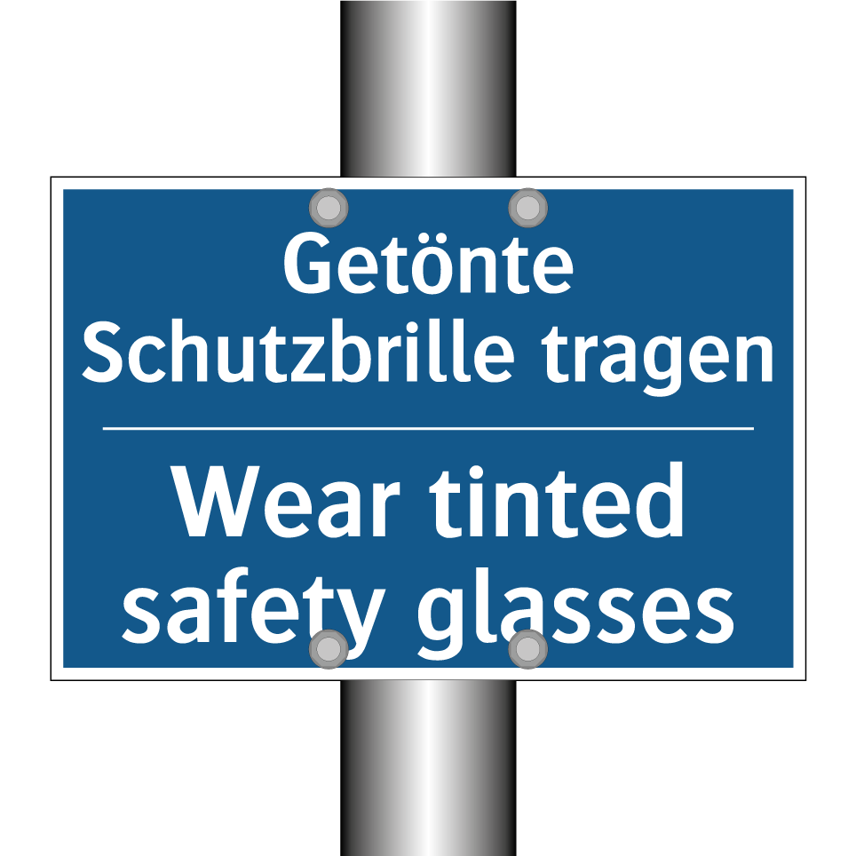 Zweisprachiges Verbotsschild mit deutschem Text Getönte Schutzbrille tragen und englischem Text Wear tinted safety glasses