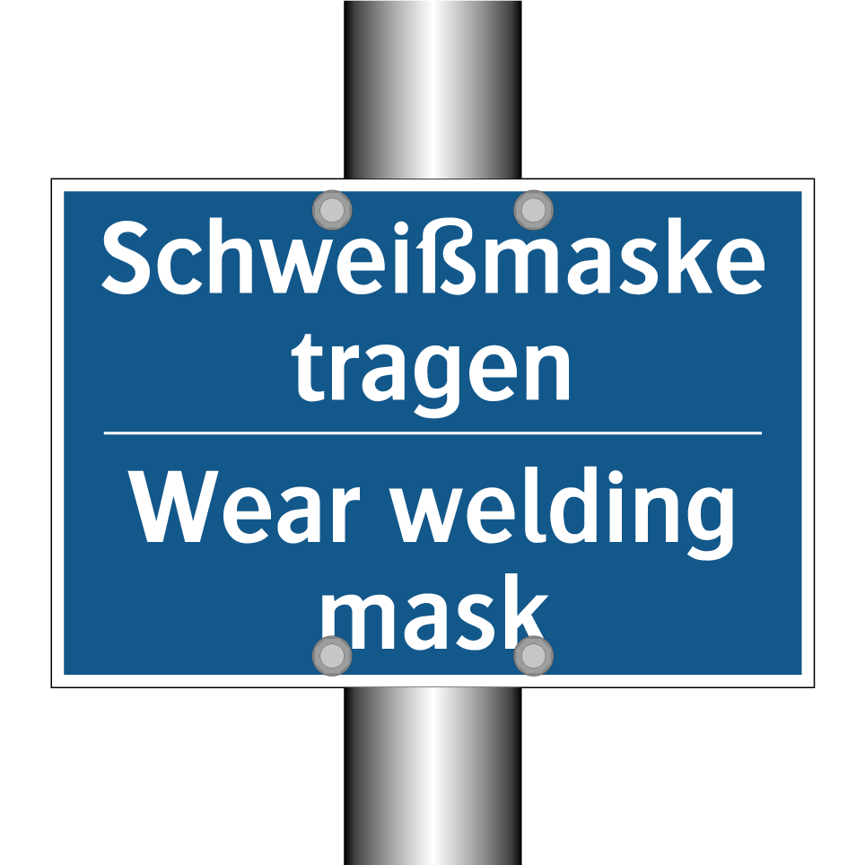 Zweisprachiges Verbotsschild mit deutschem Text Schweißmaske tragen und englischem Text Wear welding mask