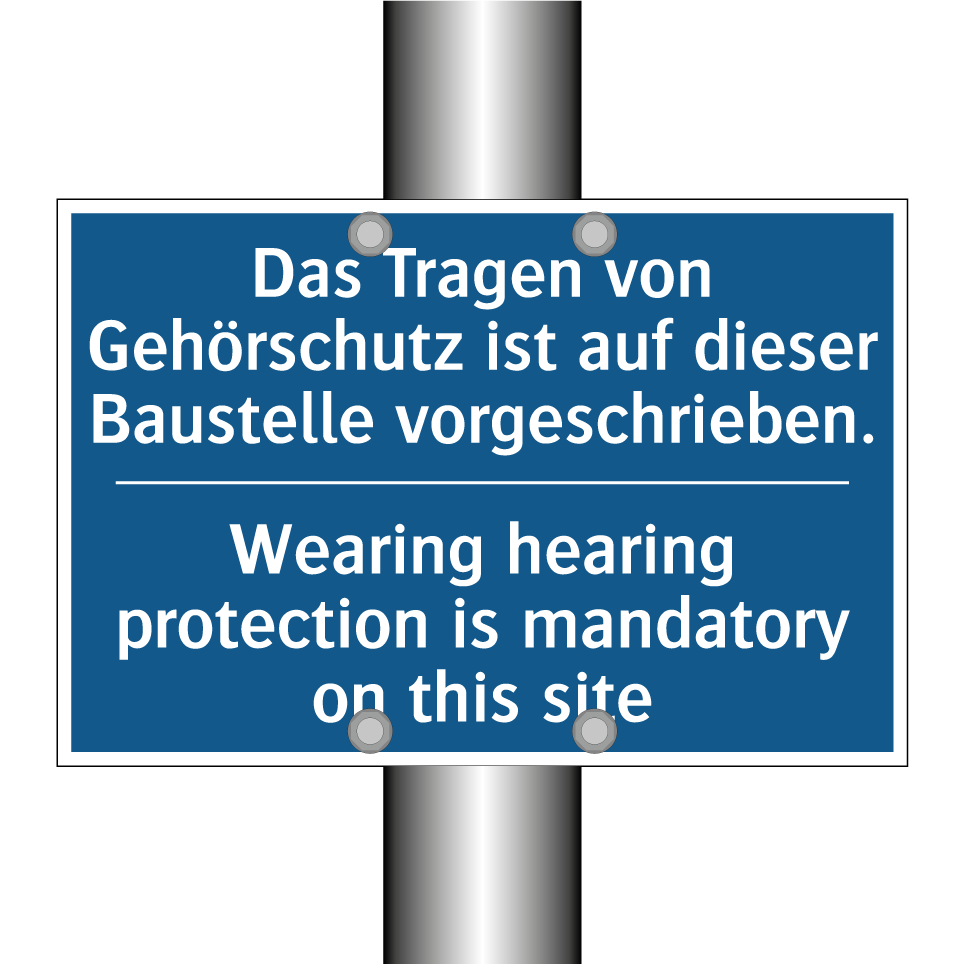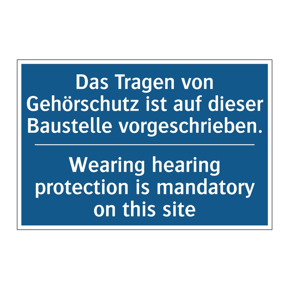 Zweisprachiges Verbotsschild mit deutschem Text Das Tragen von Gehörschutz ist auf dieser Baustelle vorgeschrieben. und englischem Text Wearing hearing protection is mandatory on this site
