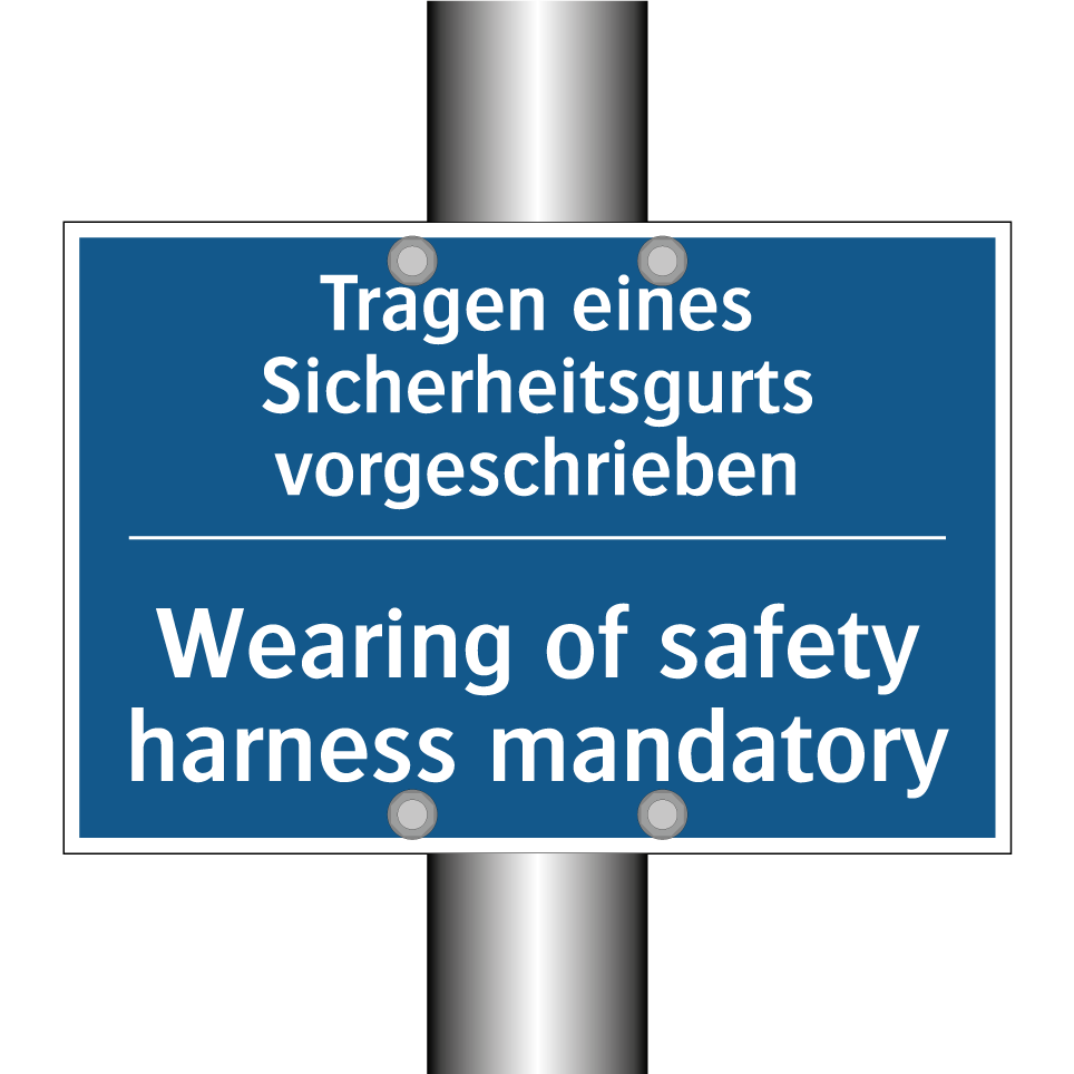 Zweisprachiges Verbotsschild mit deutschem Text Tragen eines Sicherheitsgurts vorgeschrieben und englischem Text Wearing of safety harness mandatory