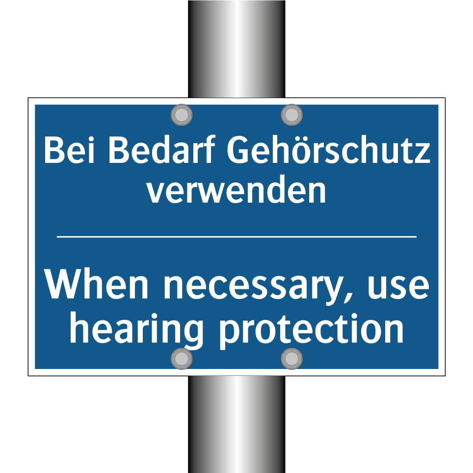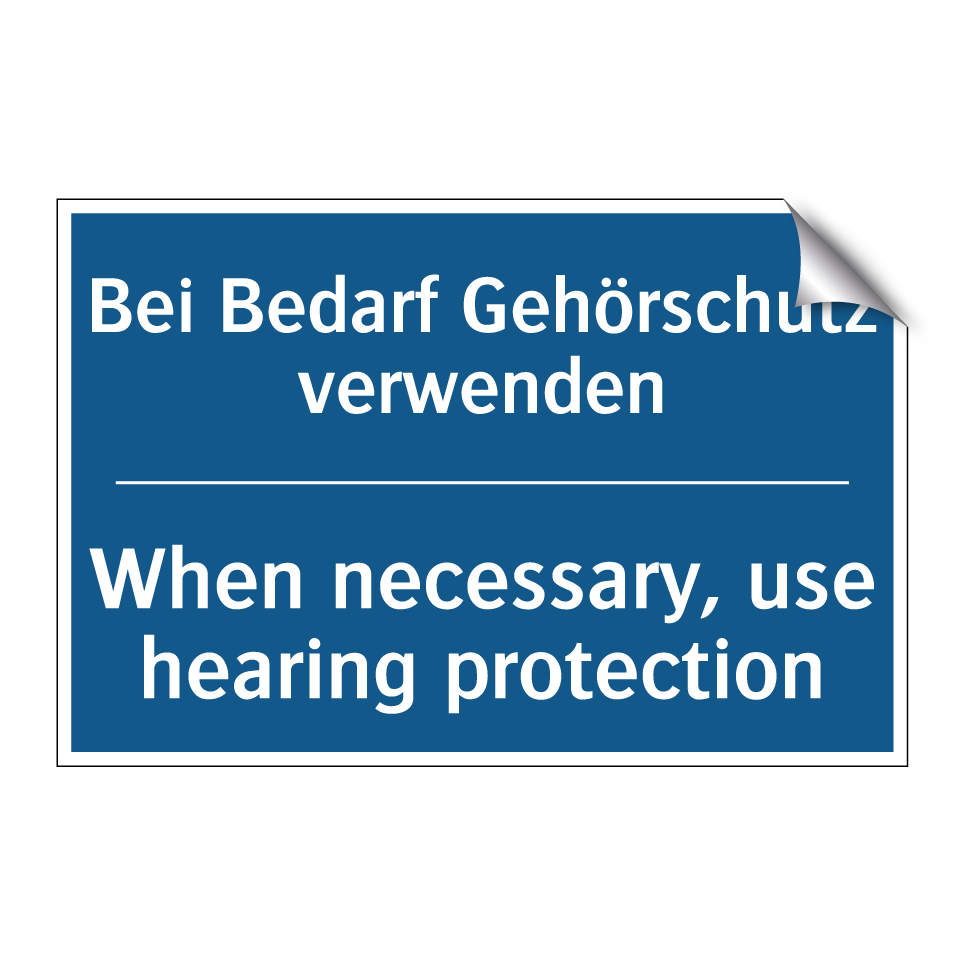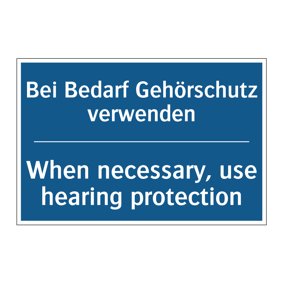 Zweisprachiges Verbotsschild mit deutschem Text Bei Bedarf Gehörschutz verwenden und englischem Text When necessary, use hearing protection