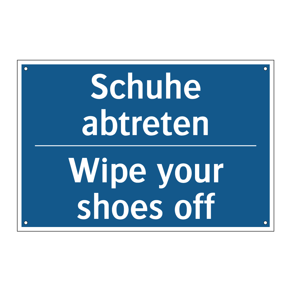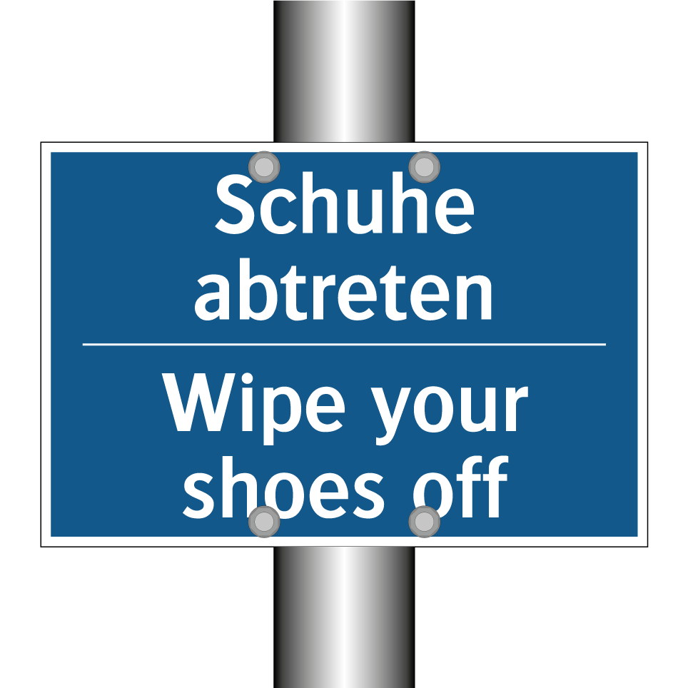 Zweisprachiges Verbotsschild mit deutschem Text Schuhe abtreten und englischem Text Wipe your shoes off