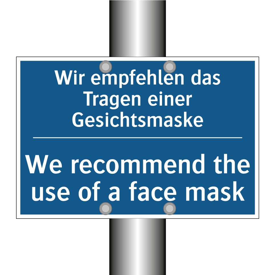 Zweisprachiges Verbotsschild mit deutschem Text Wir empfehlen das Tragen einer Gesichtsmaske und englischem Text We recommend the use of a face mask