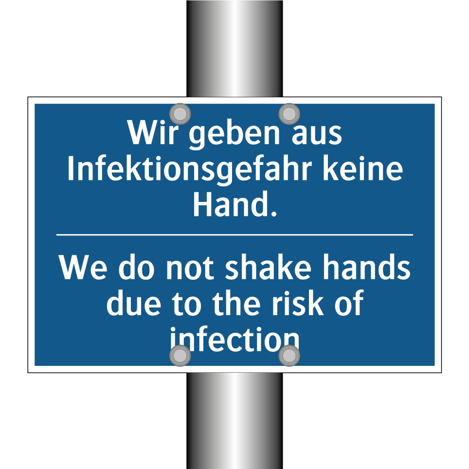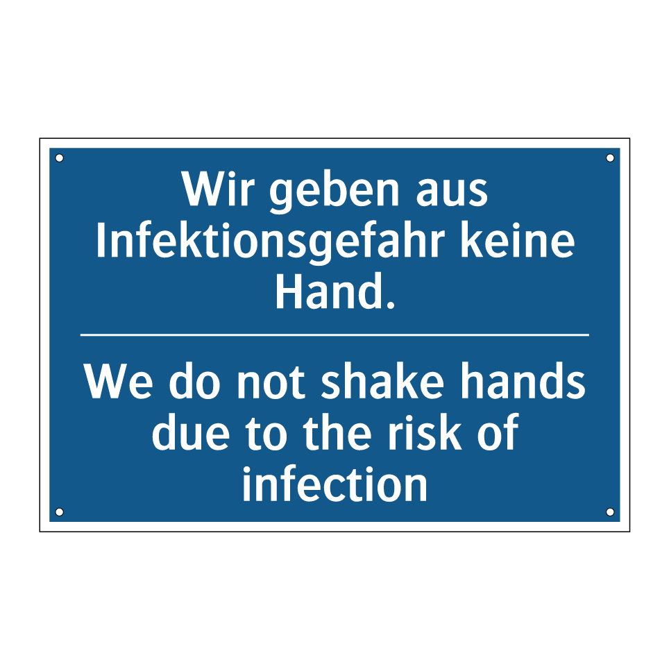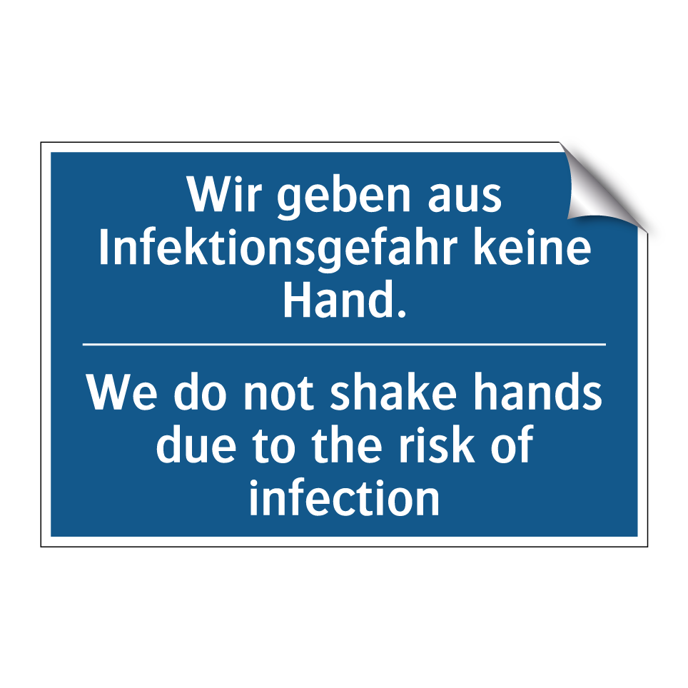 Zweisprachiges Verbotsschild mit deutschem Text Wir geben aus Infektionsgefahr keine Hand. und englischem Text We do not shake hands due to the risk of infection