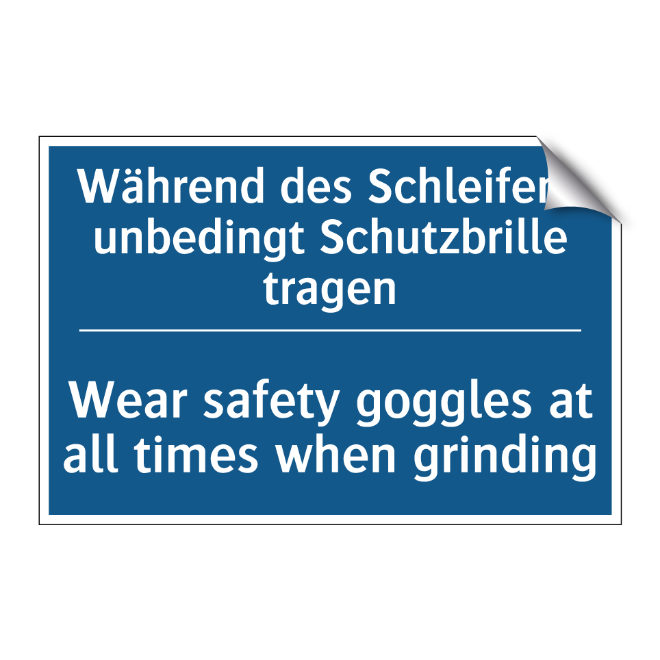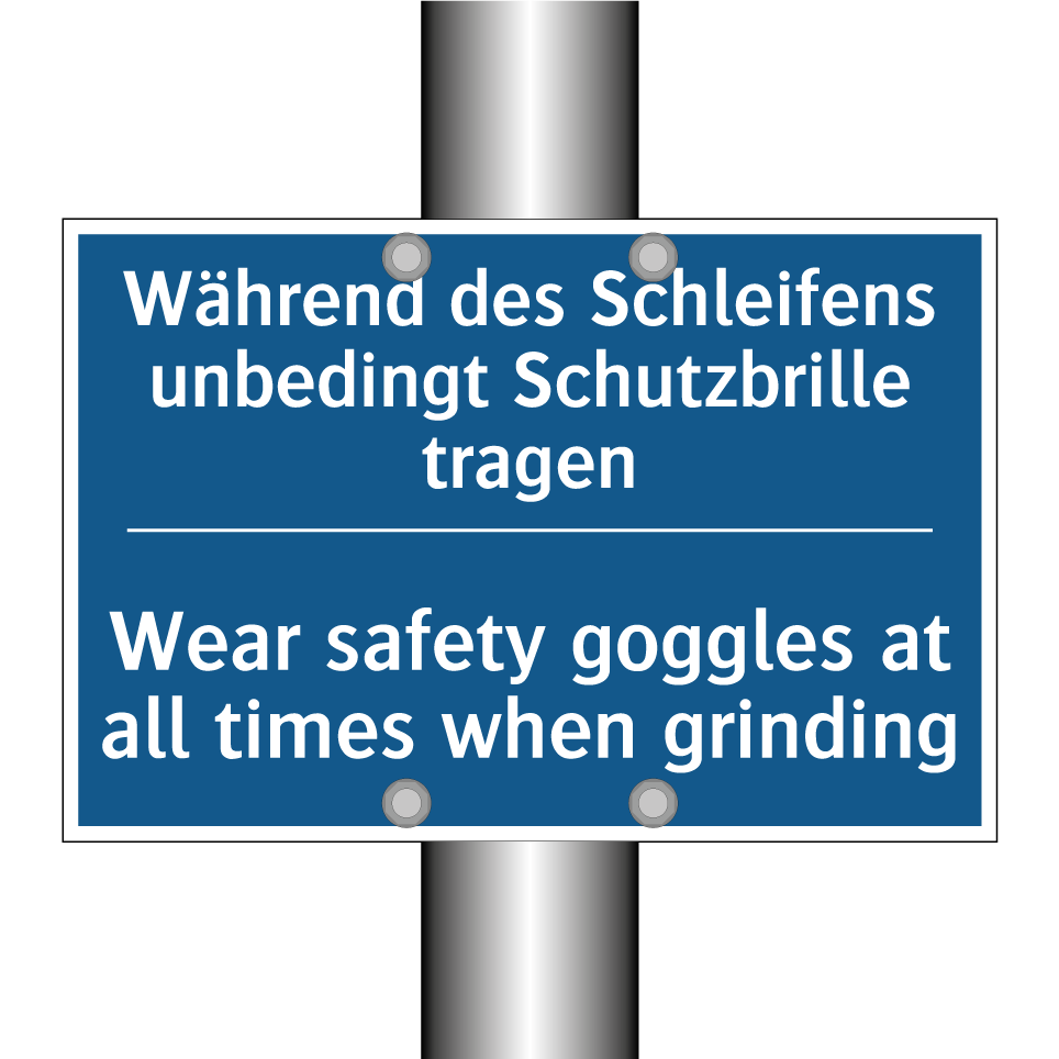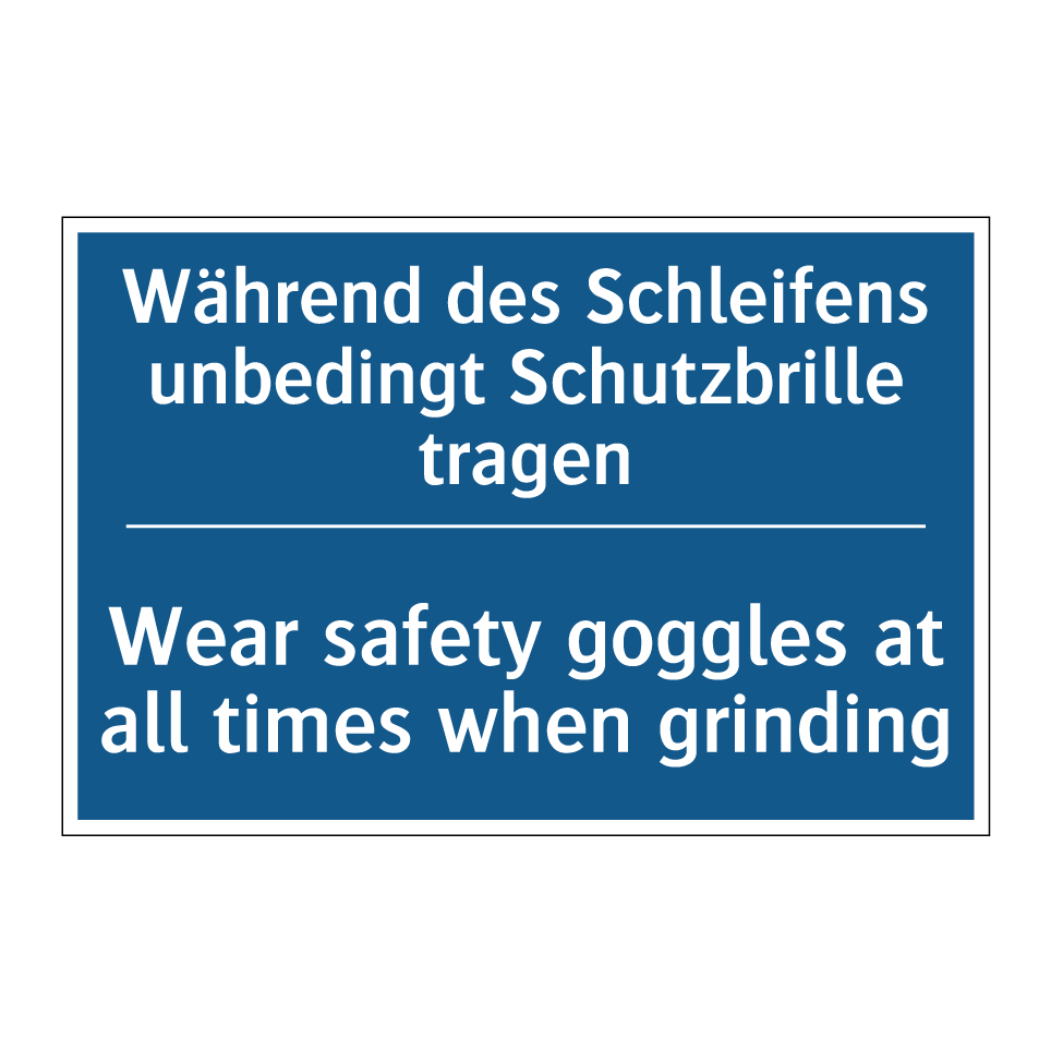 Zweisprachiges Verbotsschild mit deutschem Text Während des Schleifens unbedingt Schutzbrille tragen und englischem Text Wear safety goggles at all times when grinding
