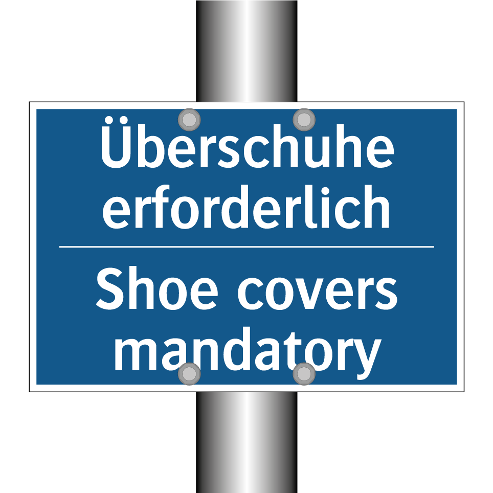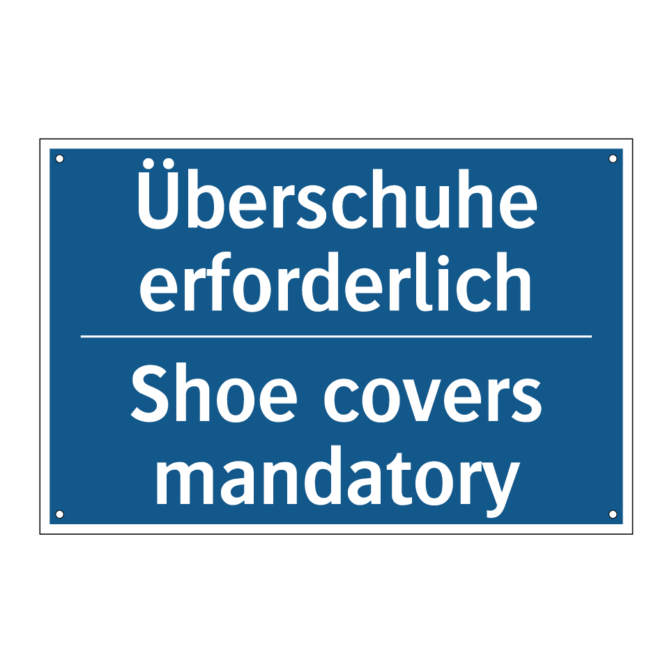Zweisprachiges Verbotsschild mit deutschem Text Überschuhe erforderlich und englischem Text Shoe covers mandatory