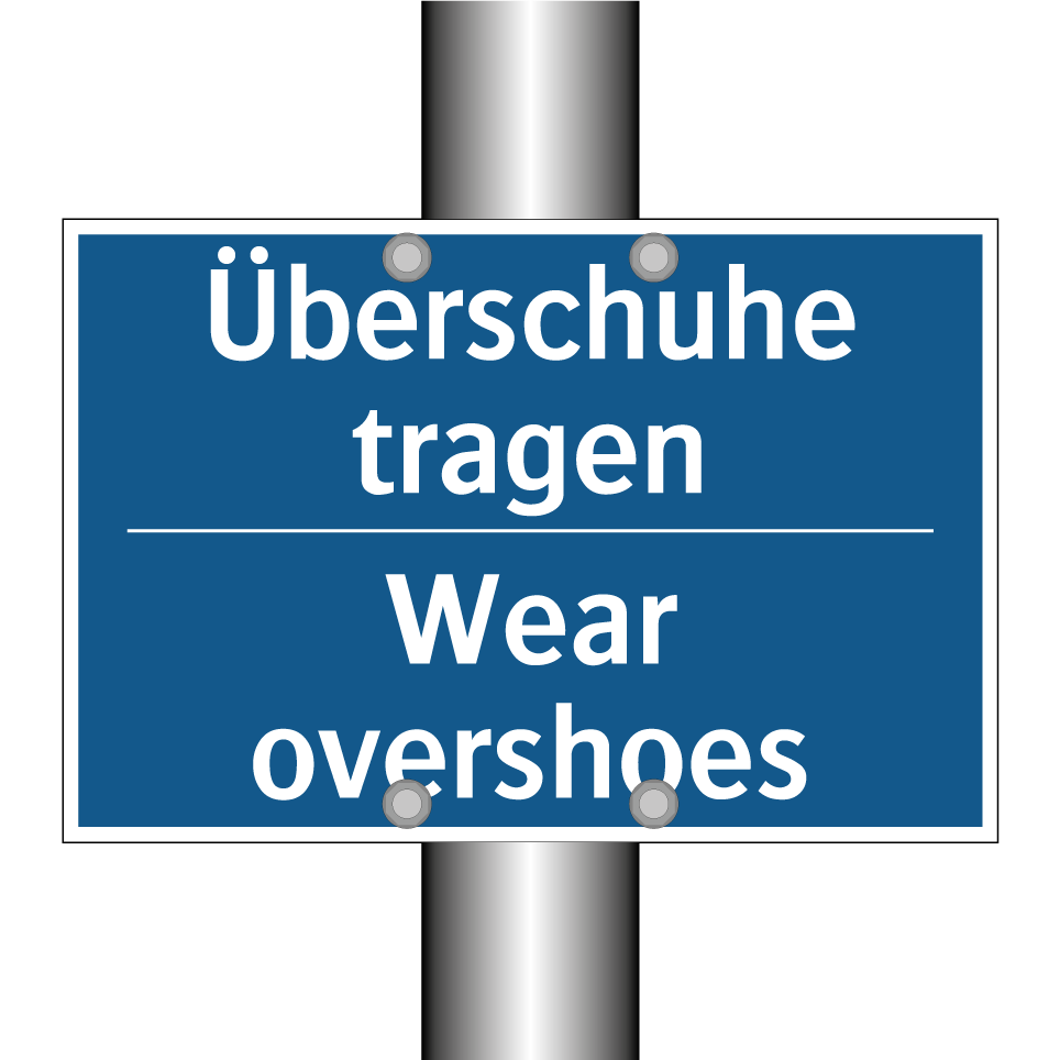 Zweisprachiges Verbotsschild mit deutschem Text Überschuhe tragen und englischem Text Wear overshoes
