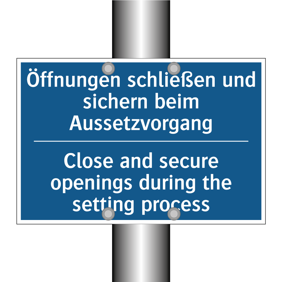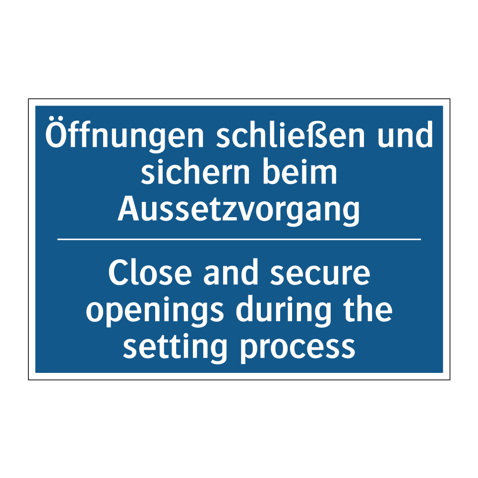 Zweisprachiges Verbotsschild mit deutschem Text Öffnungen schließen und sichern beim Aussetzvorgang und englischem Text Close and secure openings during the setting process