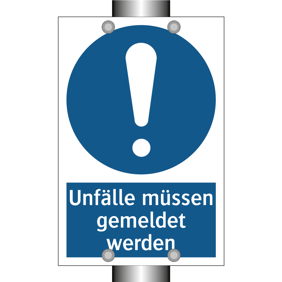 Gebotsschild mit dem Text Unfälle müssen gemeldet werden